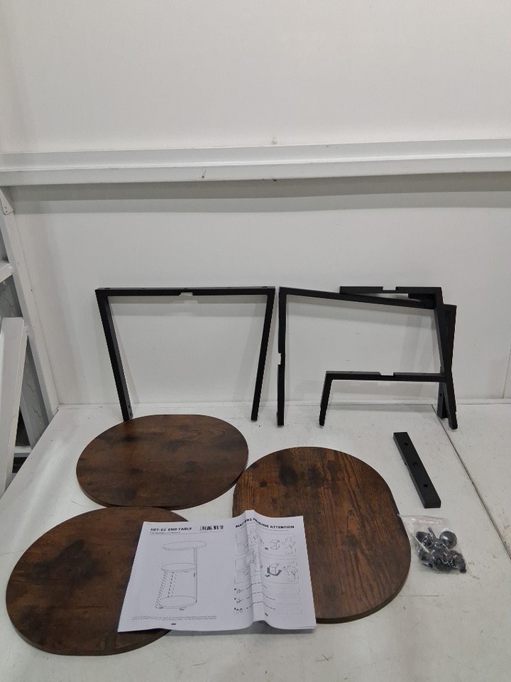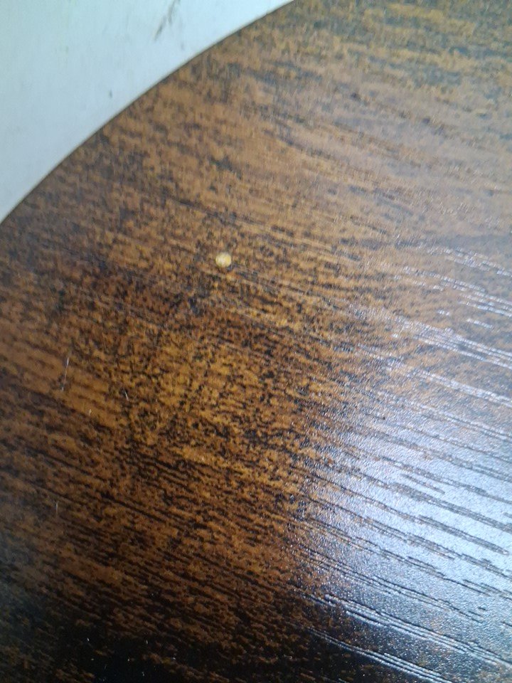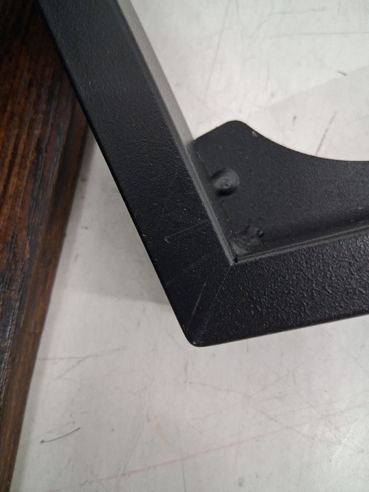 Some faint scratch marks on one of the metal pieces and one tiny wood chip on one of the tables.