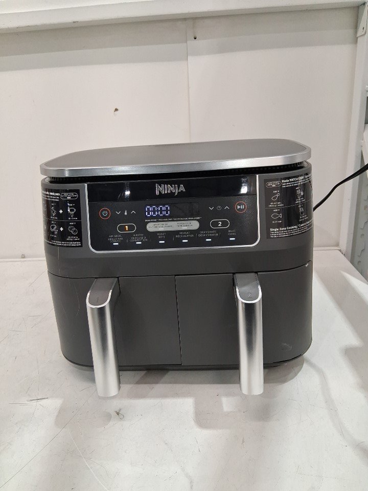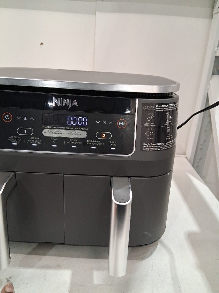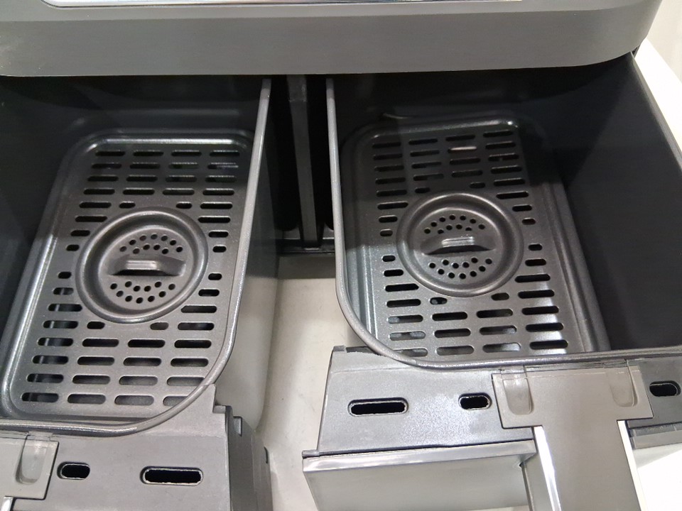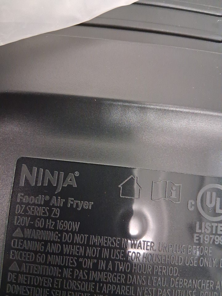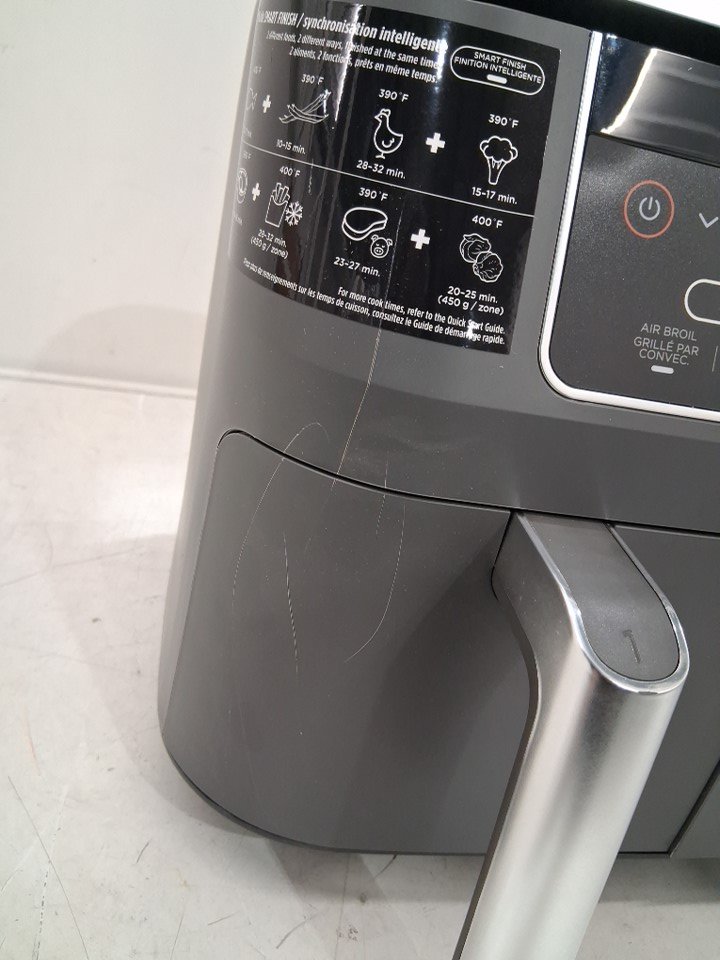 The air fryer has some scratches both inside and out, and there’s a crack on the bottom right corner that makes it a little tricky to open and close. See photos for details. It has been tested for power.