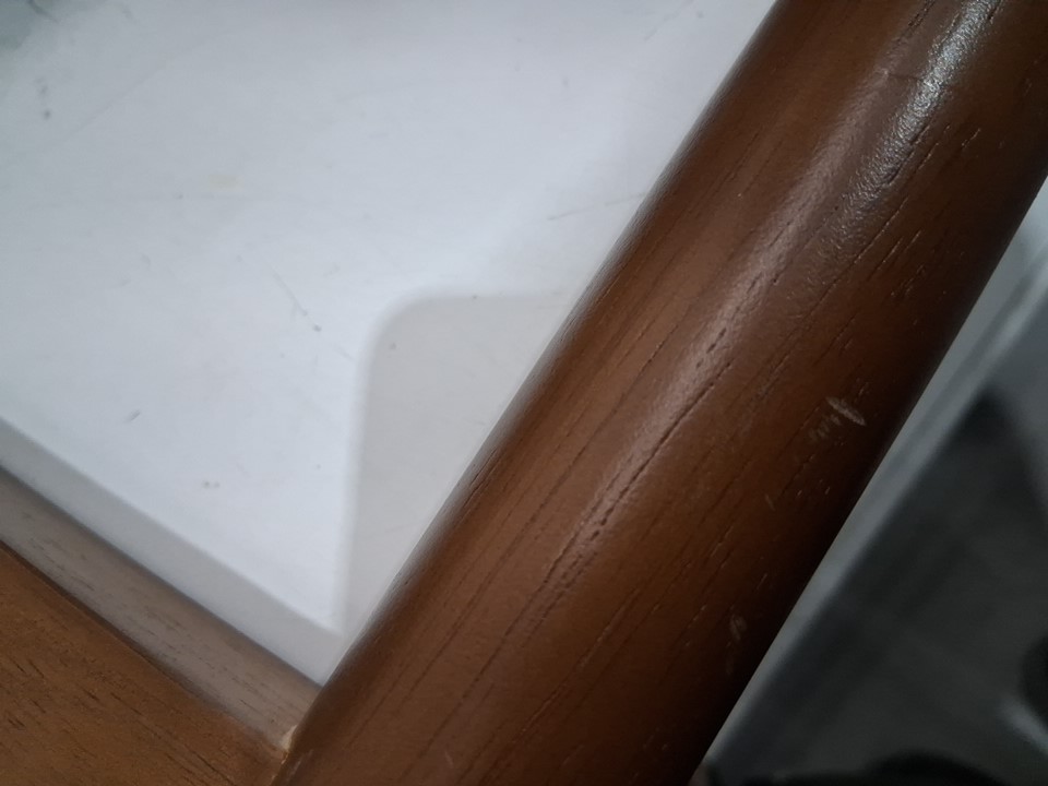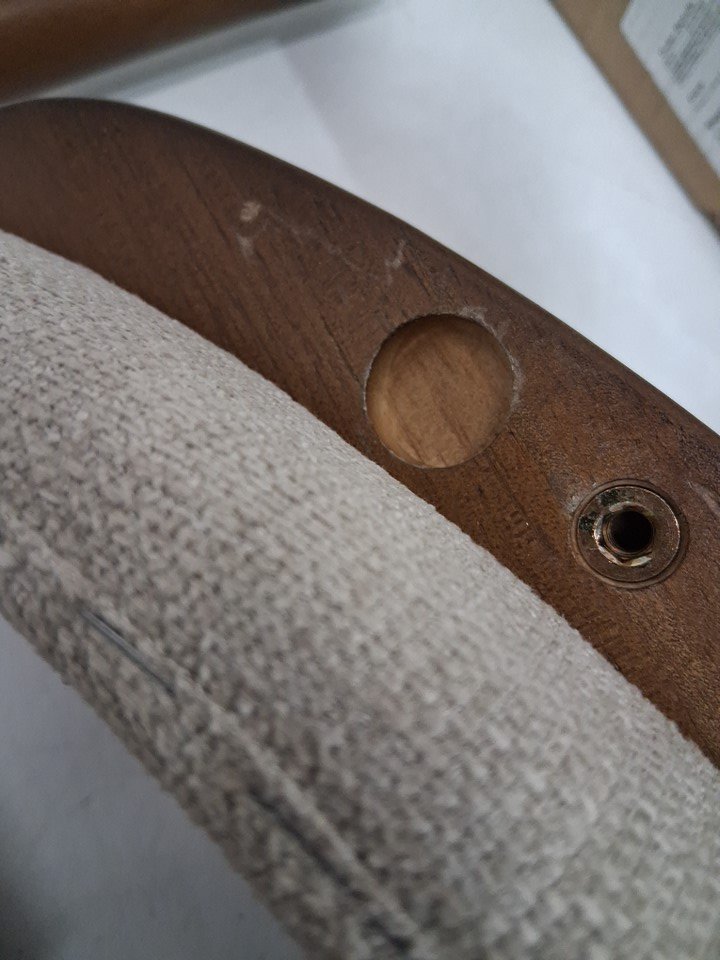 there is some marks where the hardware has been taken out, as well as marks on the wood part of the chair. no hardware loose in box. lister can not guarantee all hardware is preset.