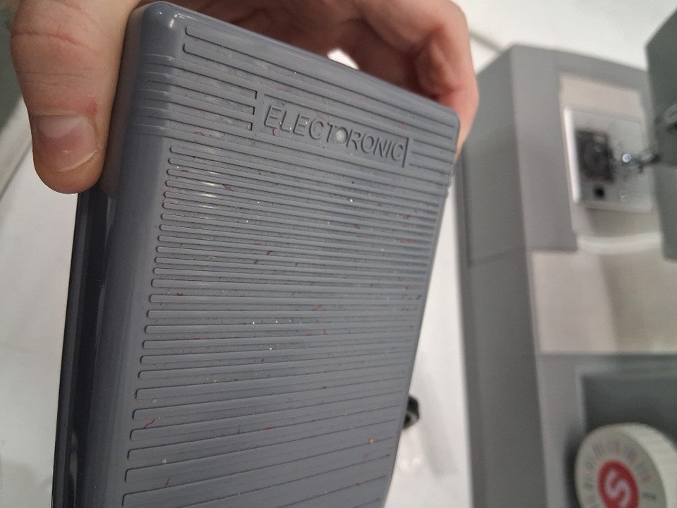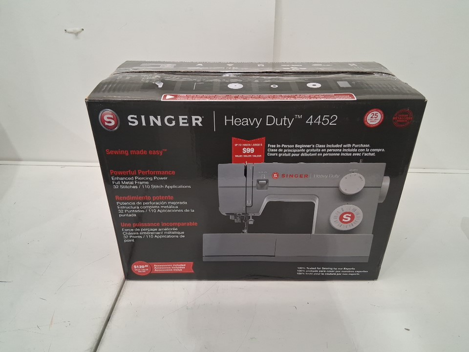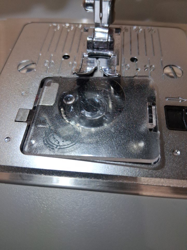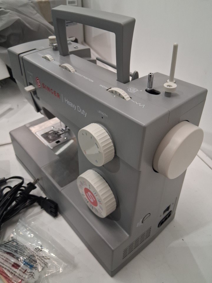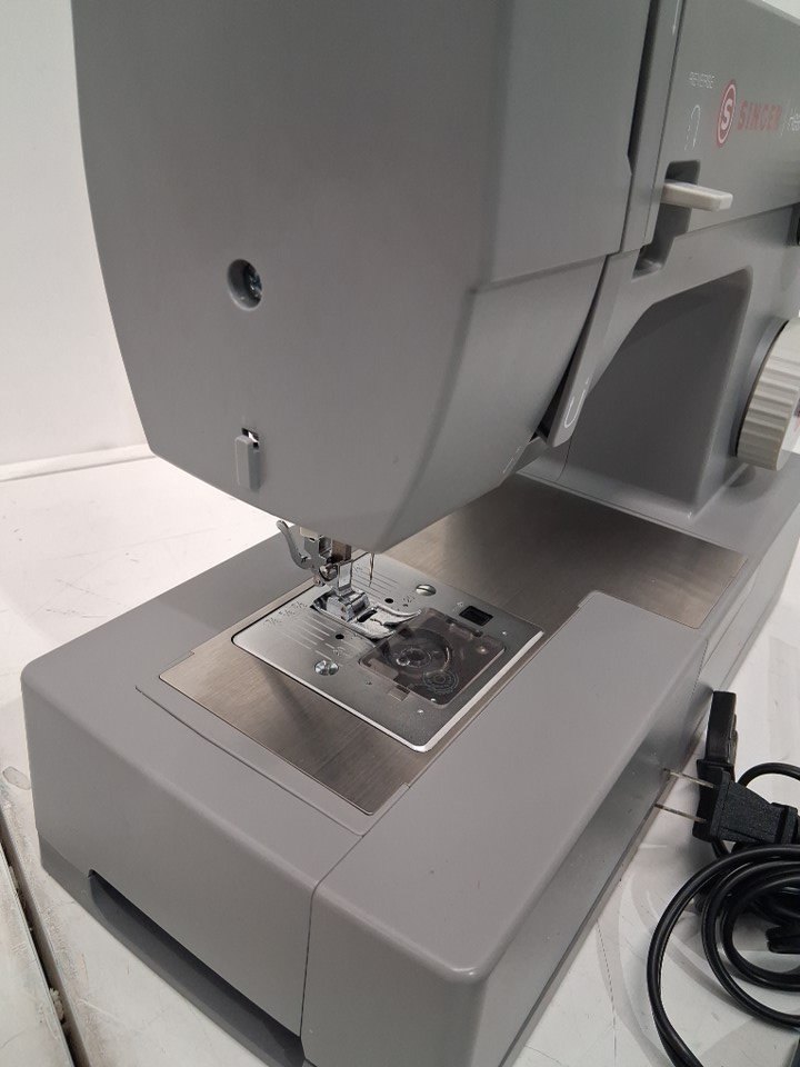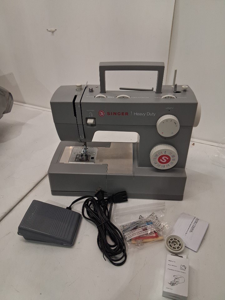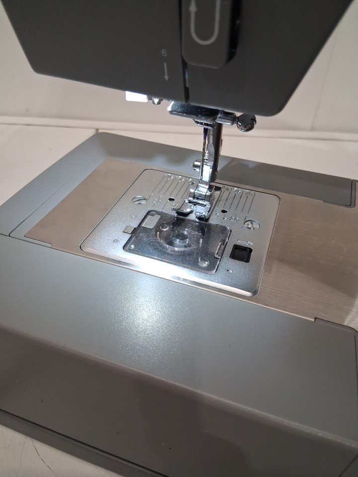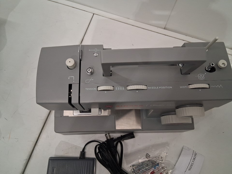 sewing machine has thread bits on pedal, and there is a small spool of thread under needle. Has been tested for power and functionality