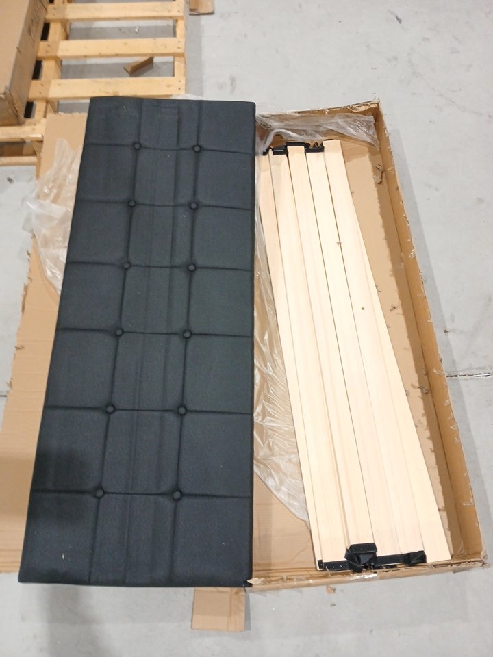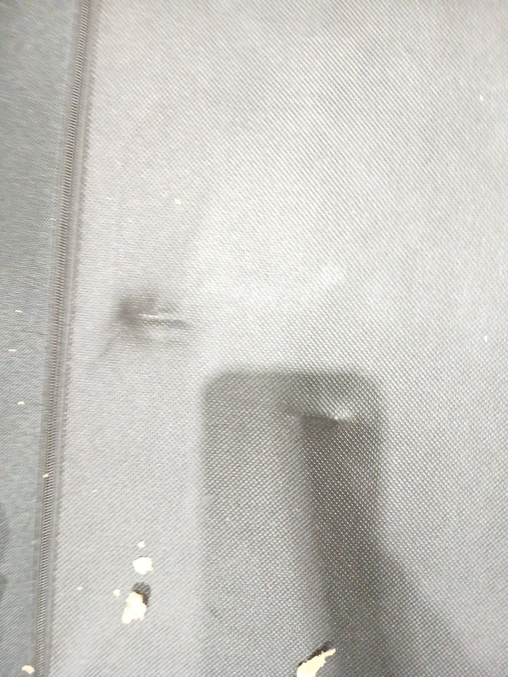 The headboard is wrinkled on the front and has scratches on the back. The back of the headboard has some indents