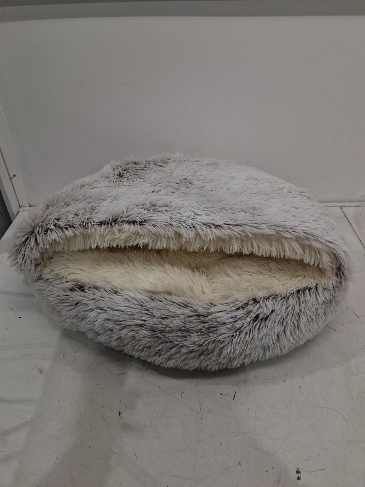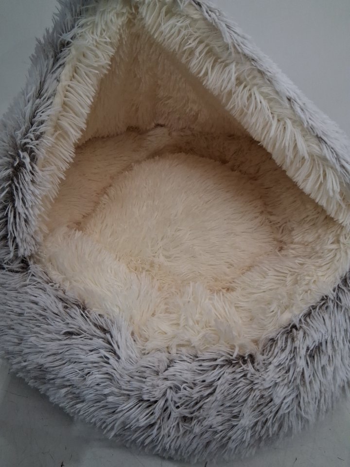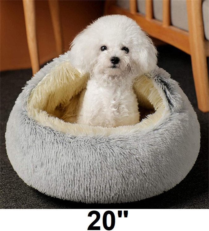 HOODED CAT BED, ROUND PET BED WITH PLUSH BURROWING CAVE, 20" - GREY/BEIGE