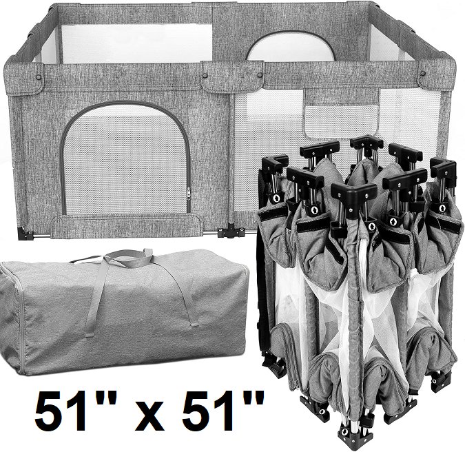 PATYWAGA Heavy Duty Collapsible Baby Playpen with Gate & carry case - 51" x 51" - grey