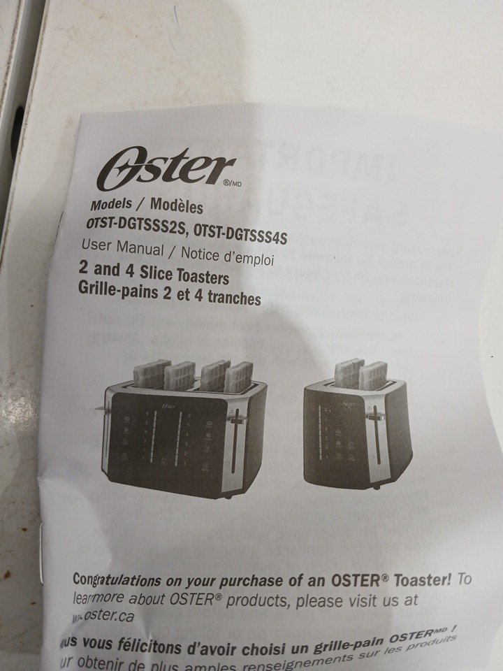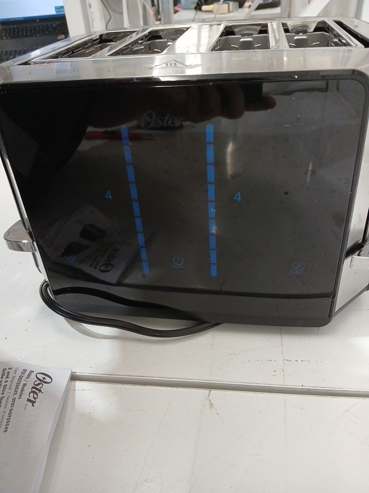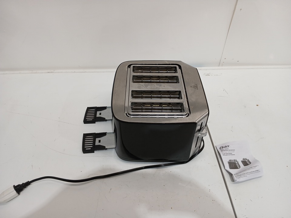 the toaster has been tested for power and has breadcrumbs in the machine from previous use.
