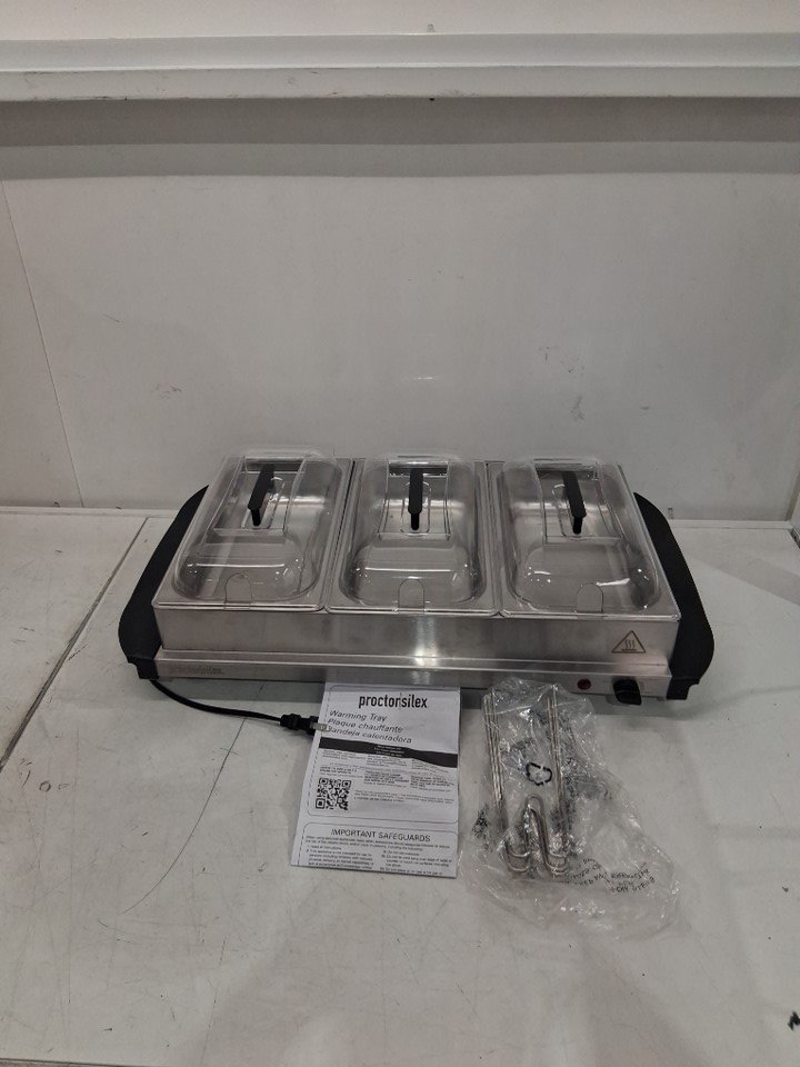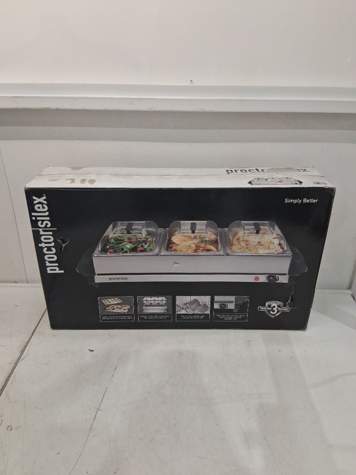Proctor Silex Triple Buffet Server & Warming Tray with 3 Oven-Safe 2.5-Quart Chafing Pans, Transparent Domed Lids, Adjustable Heat Dial, Contactless Lid Rests, Cool-Touch Handles, Dishwasher-Safe Parts - 13" x 21" - silver / black (model:34300RG)