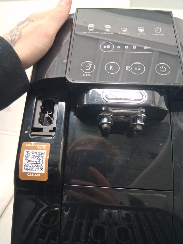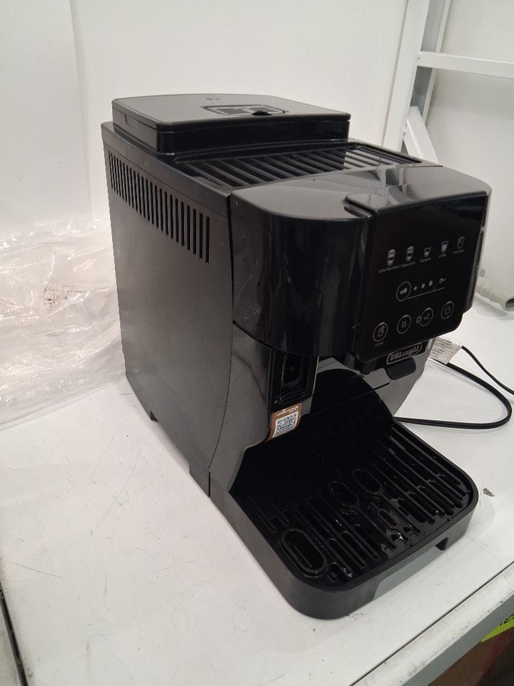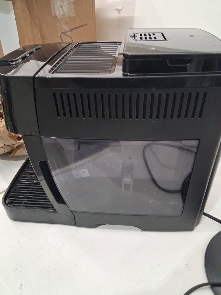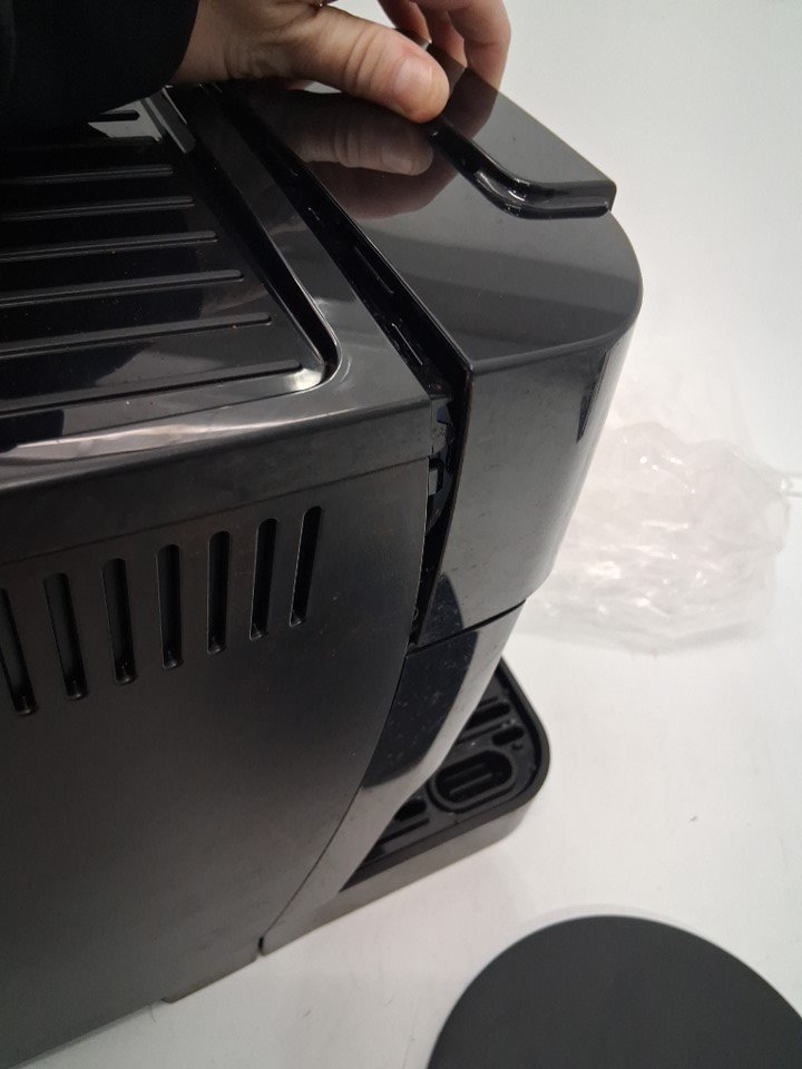 espresso machine has water spots on it and coffee bean dust. Front panel is popping off, and milk frother is missing