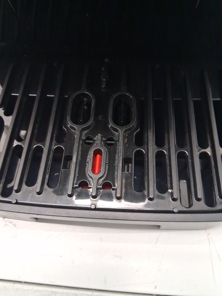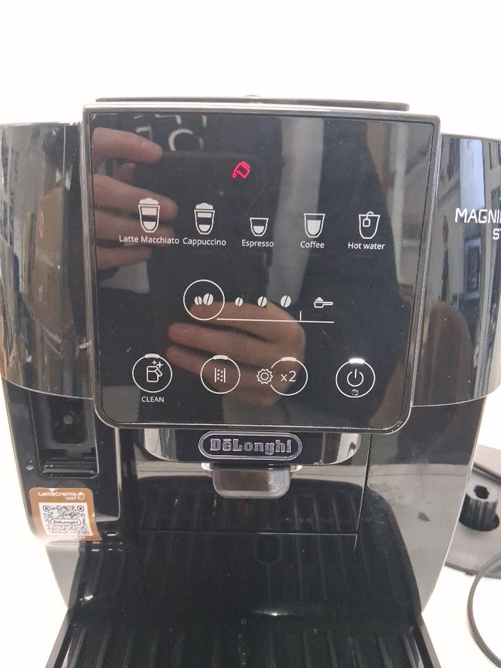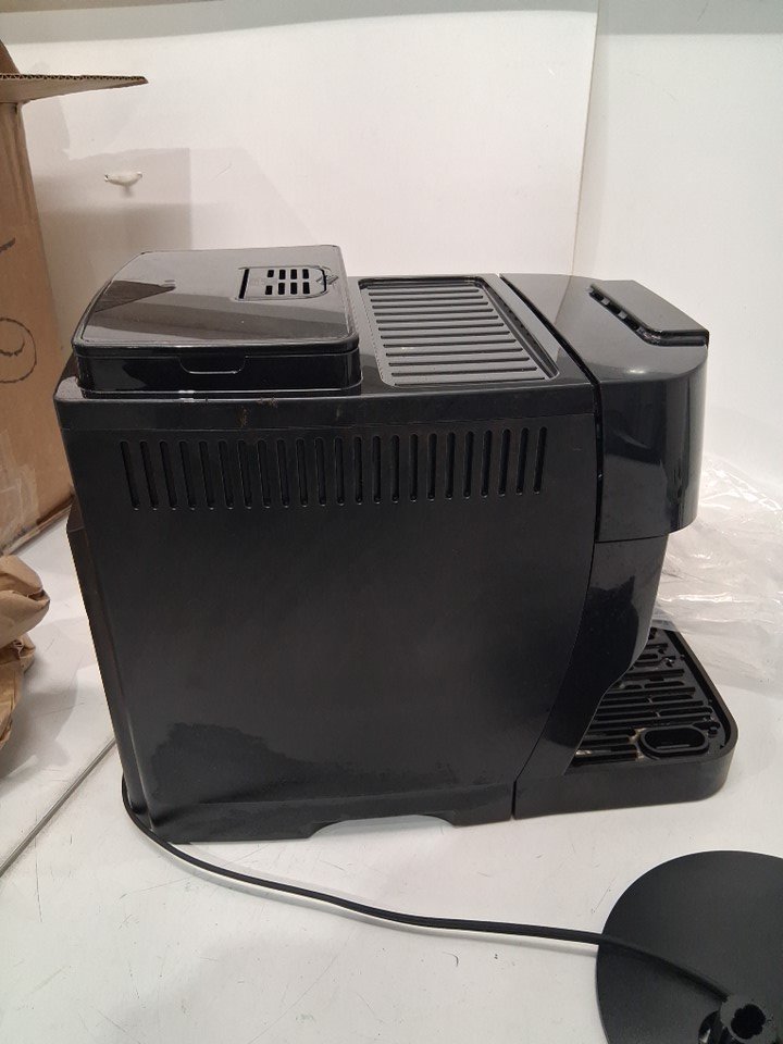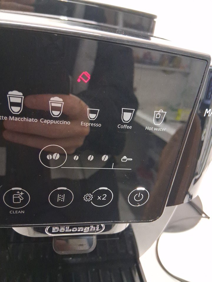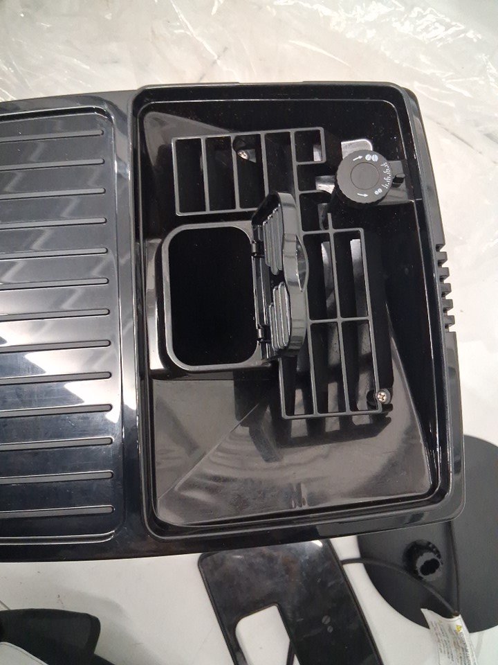 espresso machine has water spots on it and coffee bean dust. Front panel is popping off, and milk frother is missing