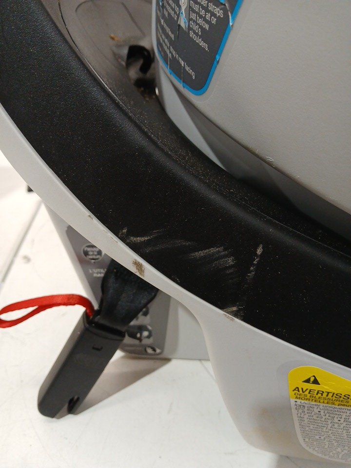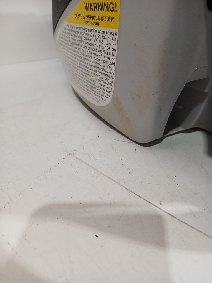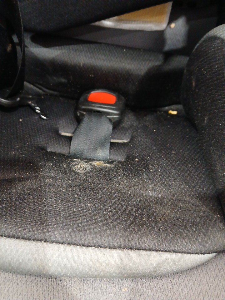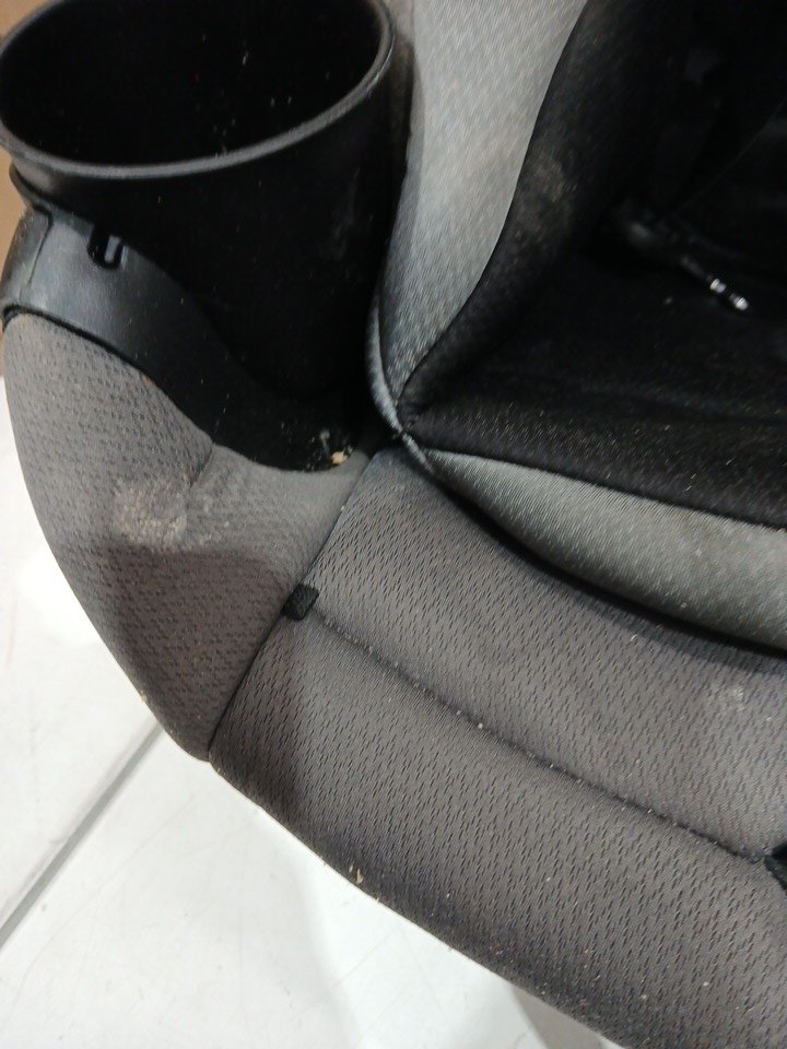 Has multiple spots/stains on the fabric of the seat and the cup holders are dirty from use. The fame of the seat has some spots and scuffs.