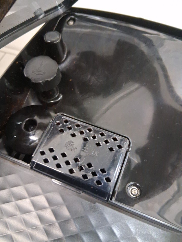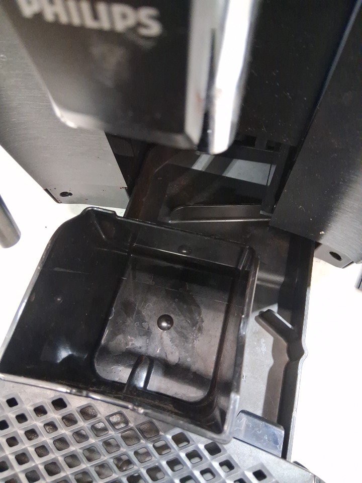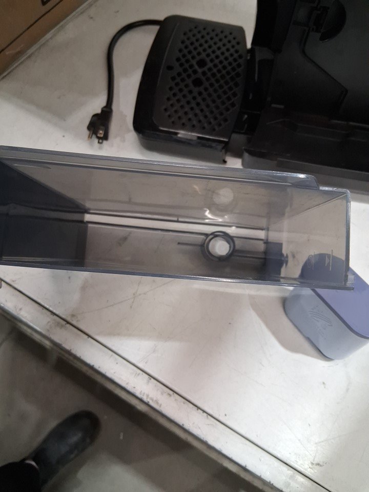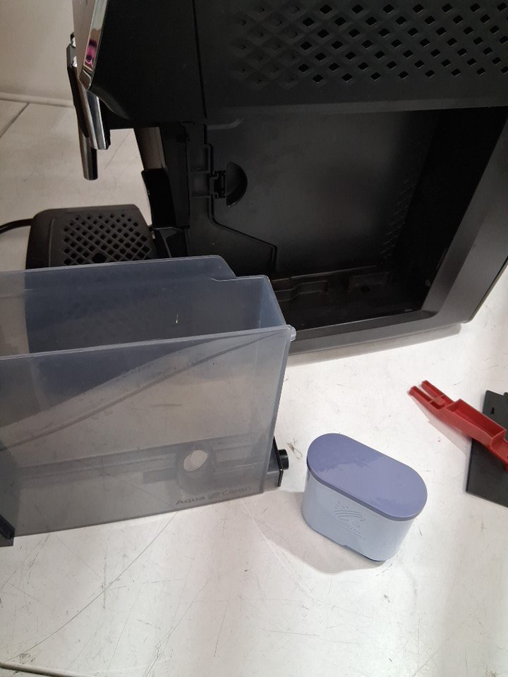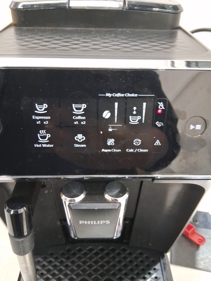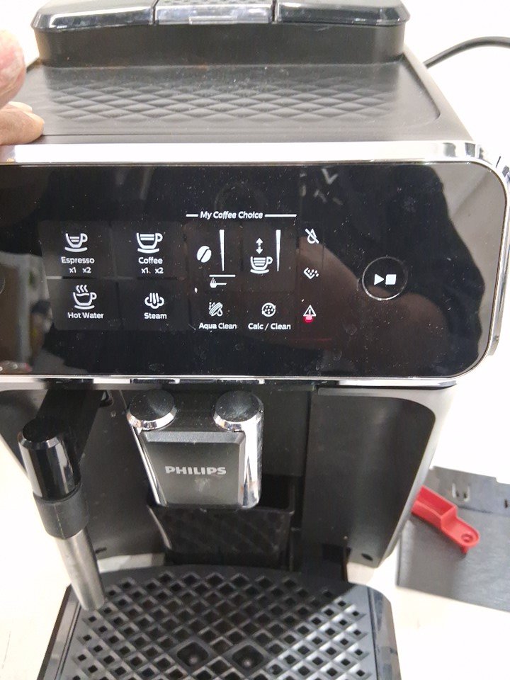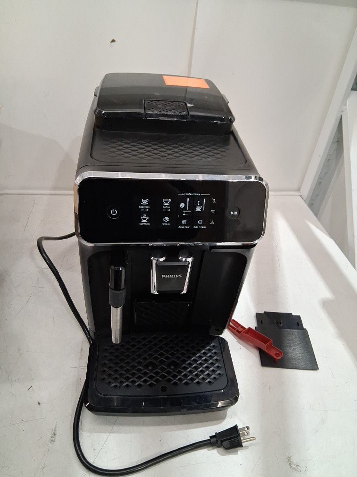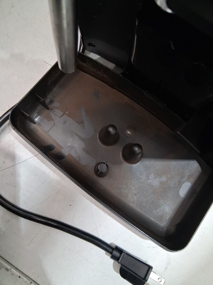 The item has coffee residue inside the machine and some water marks, along with a small dent on the back side as shown in the photos. It has been tested for power.