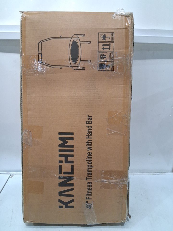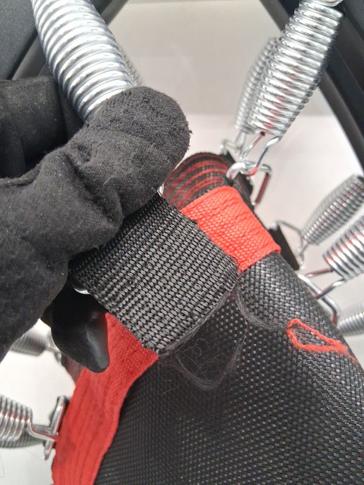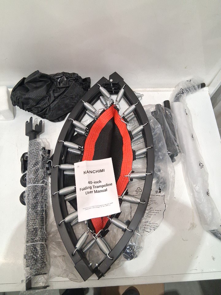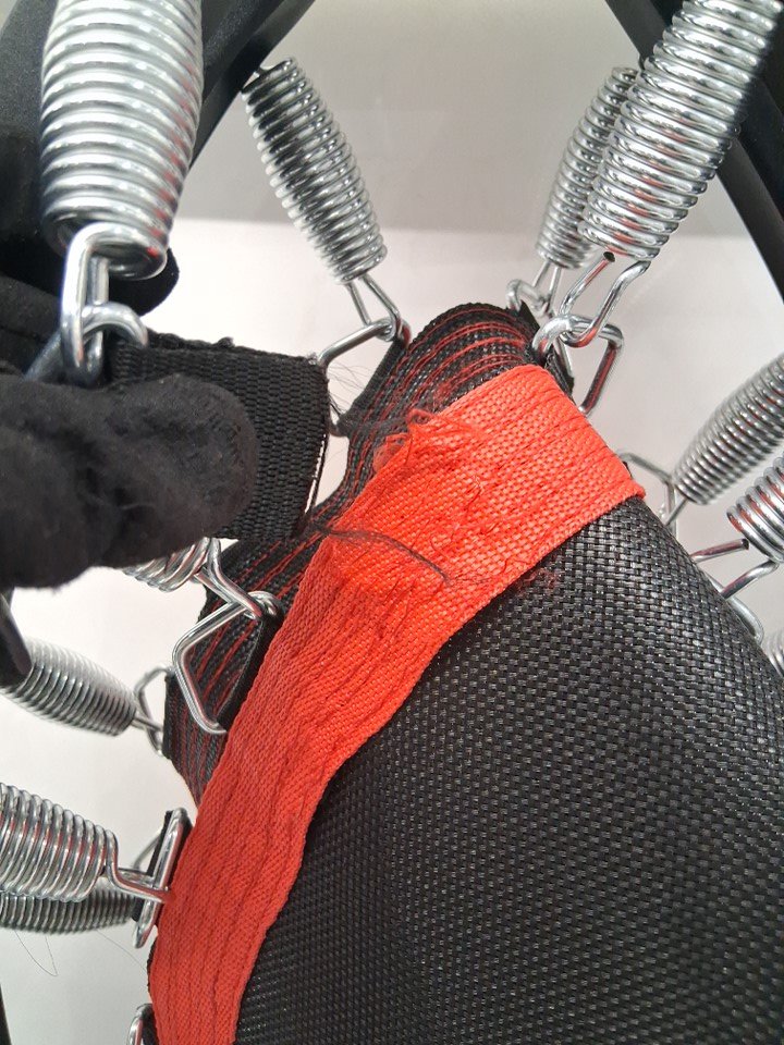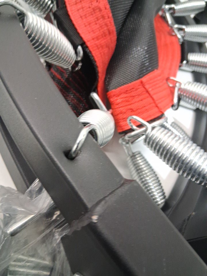 Scuffs can be found on unit but that is due to shipping. One of the straps holding the trampoline is torn.