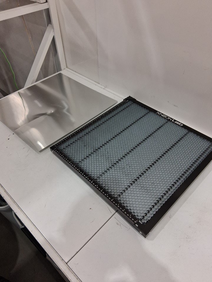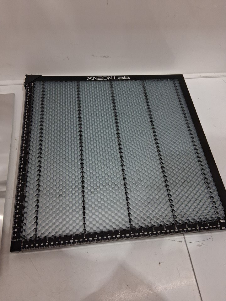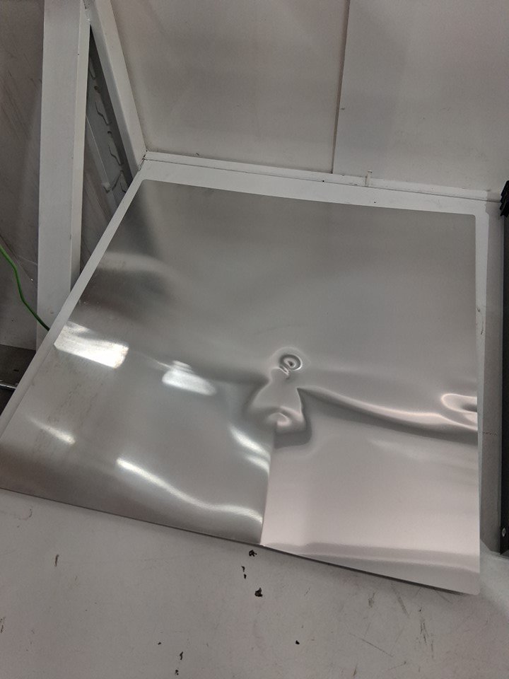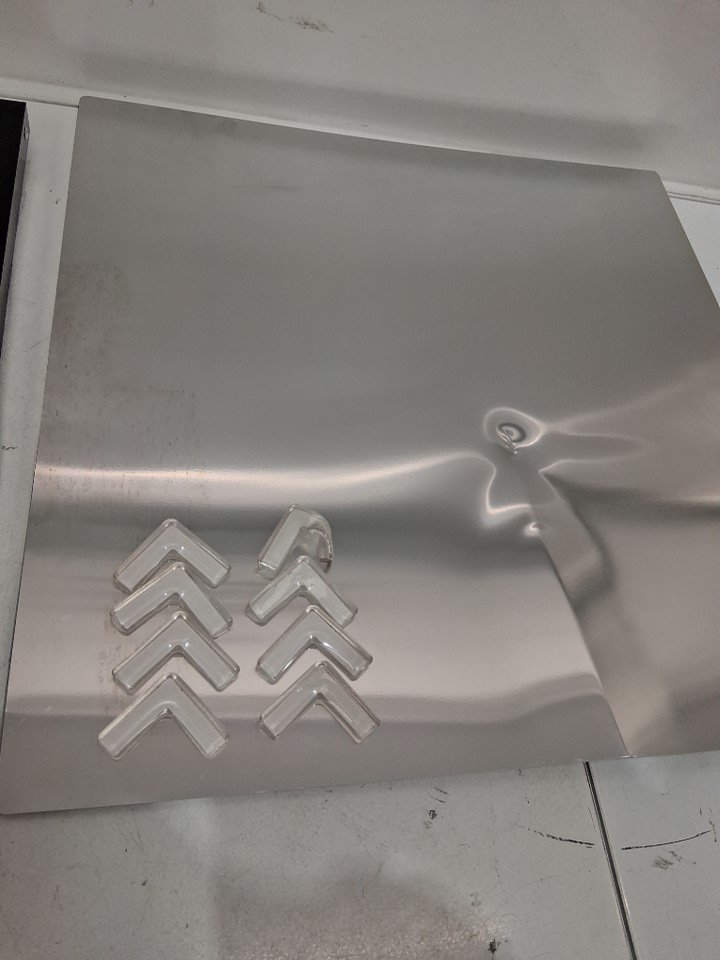 Aluminum panel is dented, 1 corner protector is bent, blue magnetic stickers are missing. Water-stained panel. May have been previously used to missing components and panel dent.