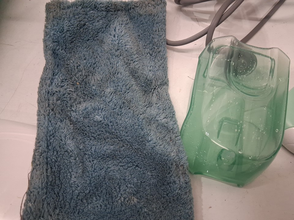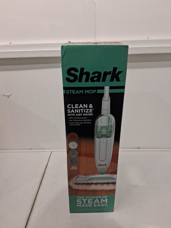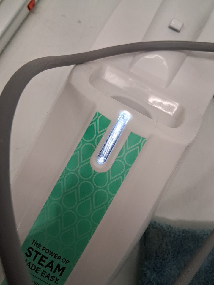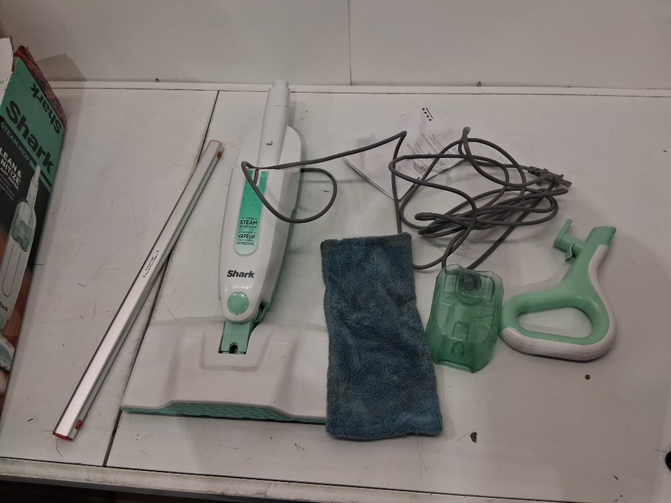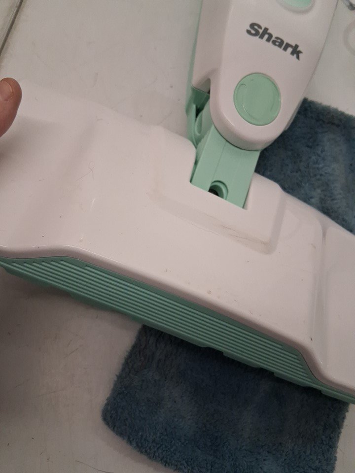 steam pad has dirt discoloration on it, water drops in water chamber, and scuffing on mop head. Has been tested for power
