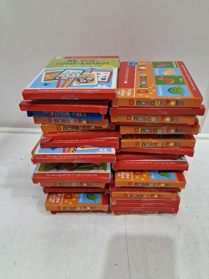 42 ASSORTED scholastic pre k to grade one level flash cards - make-and-learn, dinosaur pairs, rhyming pairs (24 to 36 cards per pack)