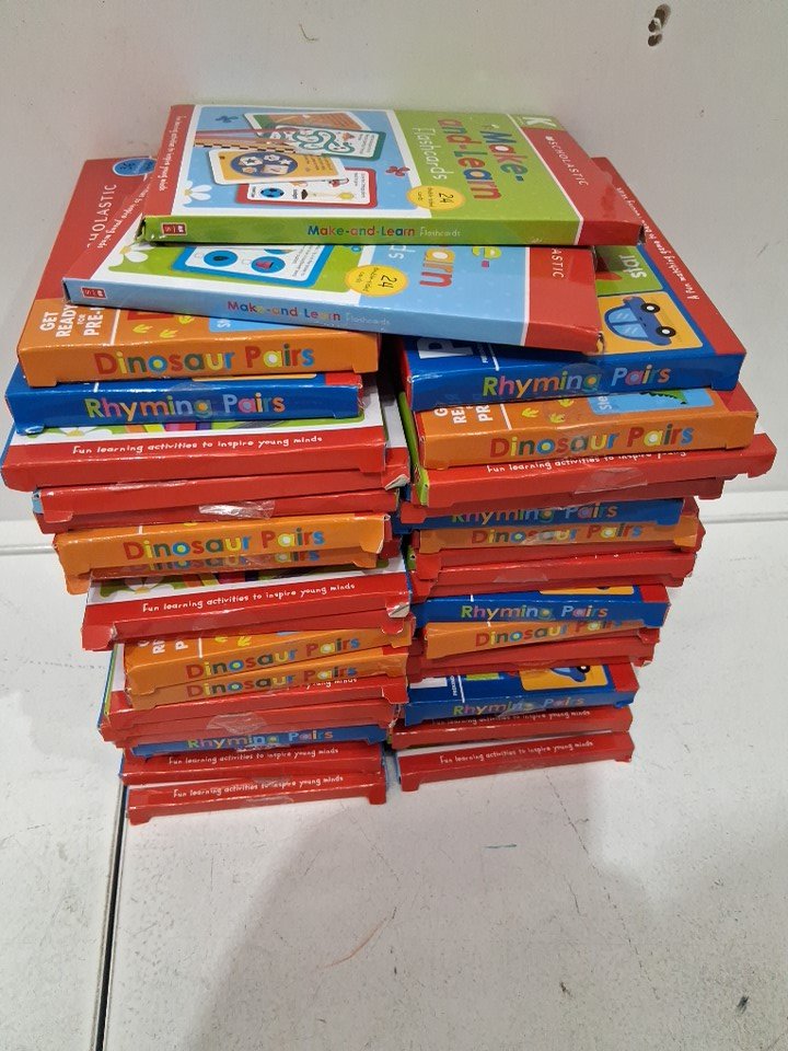 42 ASSORTED scholastic pre k to grade one level flash cards - make-and-learn, dinosaur pairs, rhyming pairs (24 to 36 cards per pack)