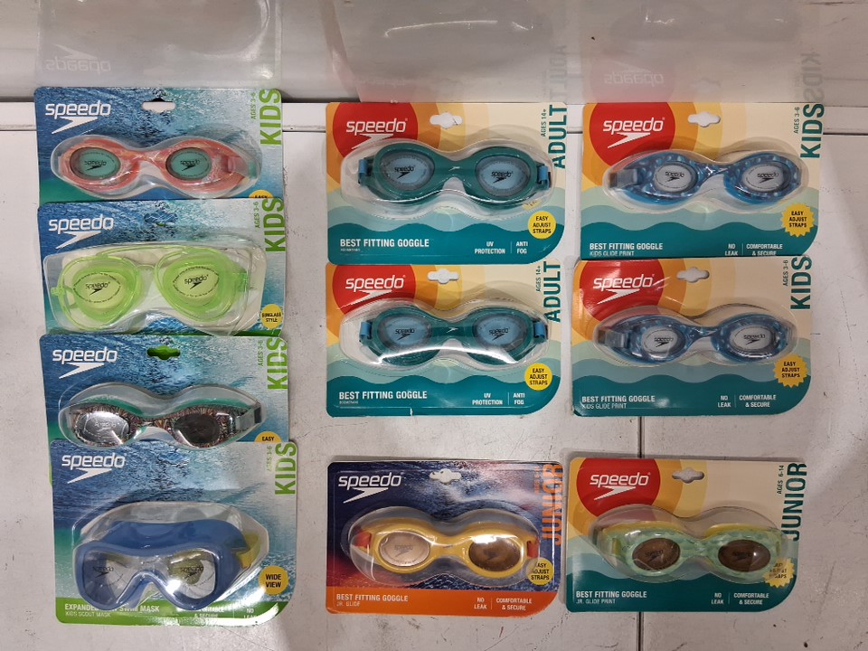 10 ASSORTED SPEEDO SWIM GOGGLES - ADULT, JUNIOR AND KIDS - ASSORTED COLOURS, STYLES AND PRINTS