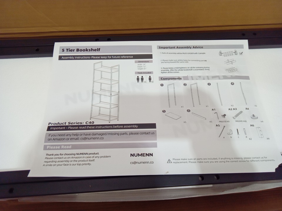 numenn 5 tier bookshelf with metal frame and wood shelves - 60" x 24" x 12" - vintage - (model: c40us01001)