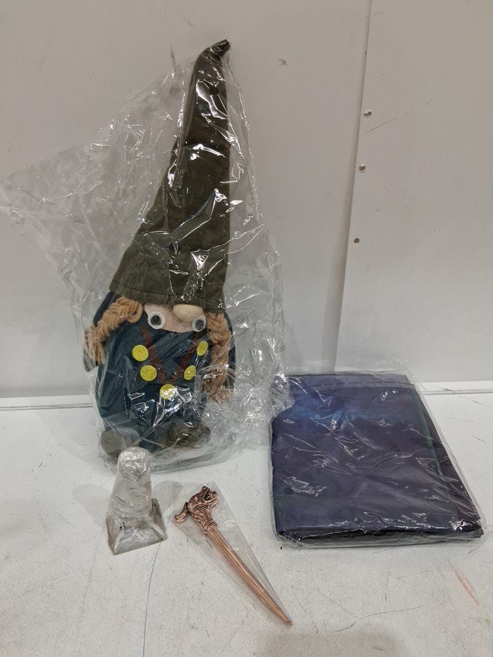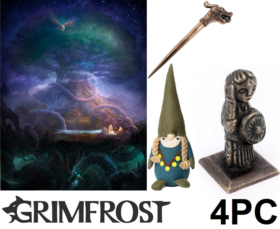 4pc assorted grimfrost viking accessories and items - Bronze Hedeby Hairpin / Freyja Tomte (14") / bronze Valkyrie Figurine (2.7") / Yggdrasil Wall Flag ( 4'10 x 3'9")