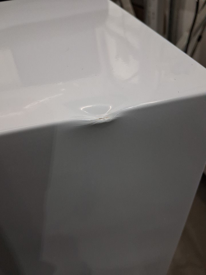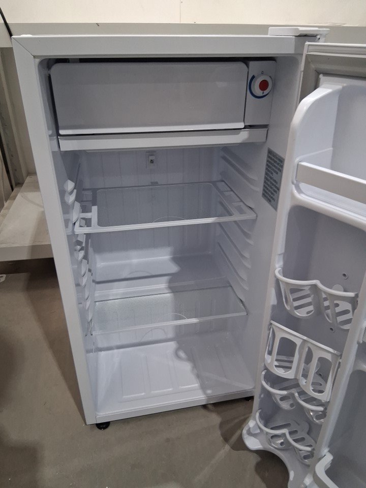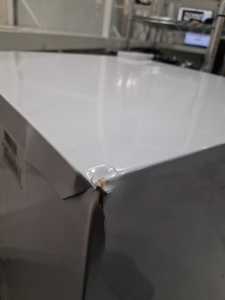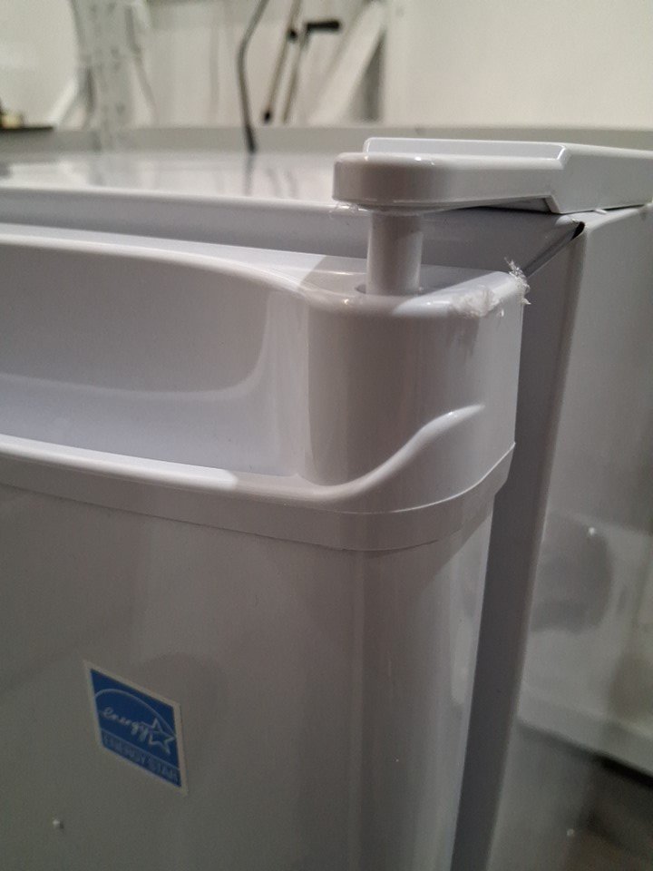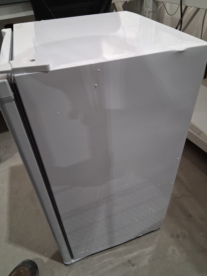There are numerous small dents on the edges/corners of the top of the fridge, and the door also appears to be slightly loose on the hinges - see photos. Briefly made a rattling sound when first plugged in to test for power, but the noise subsided after a few seconds and cooling appeared to function normally.