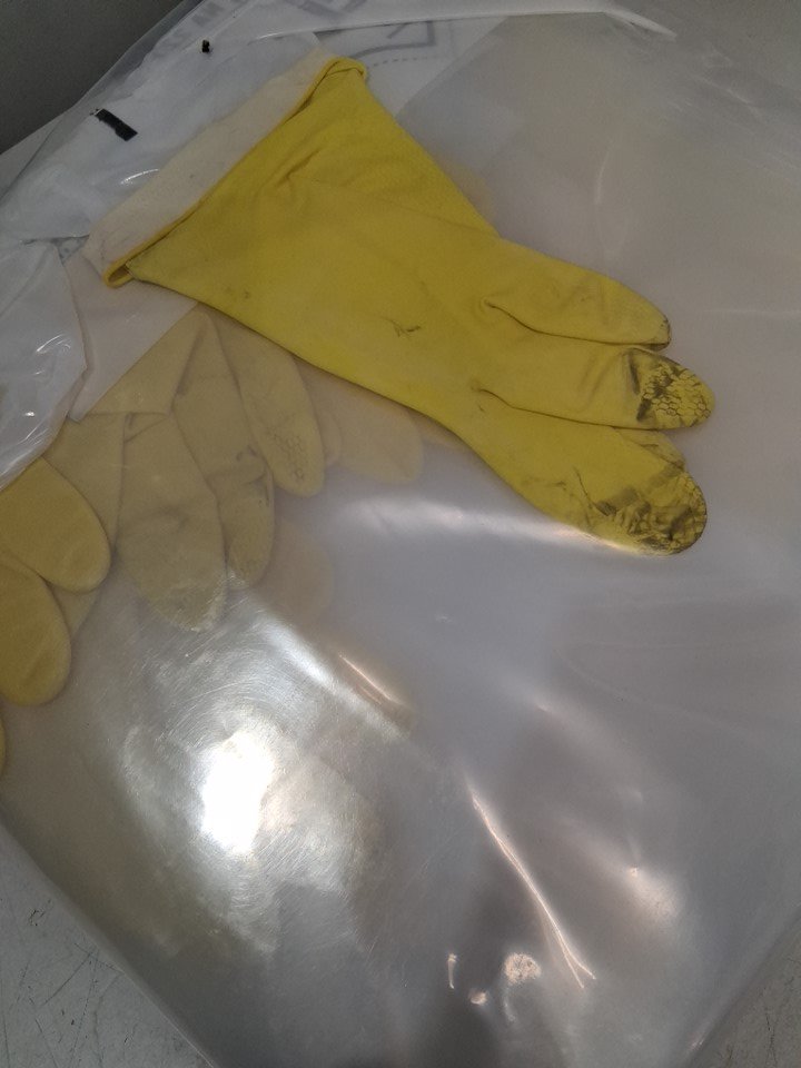 please note that the item has signs of light use - there is some dirt on the gloves- see photo's