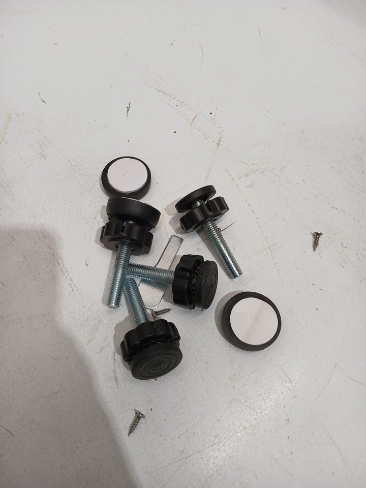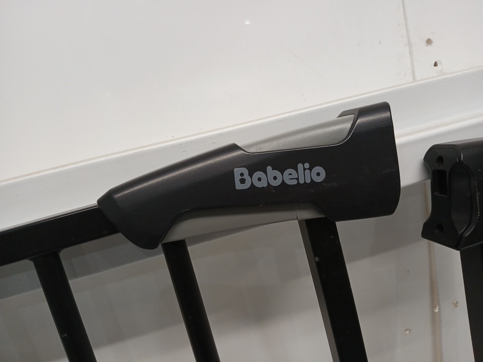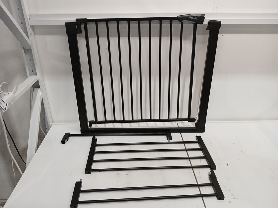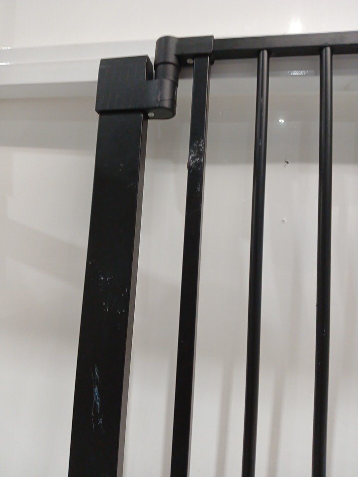 the baby gate has signs of use with some stains on the bars. some generic hardware pieces maybe needed to complete set up.