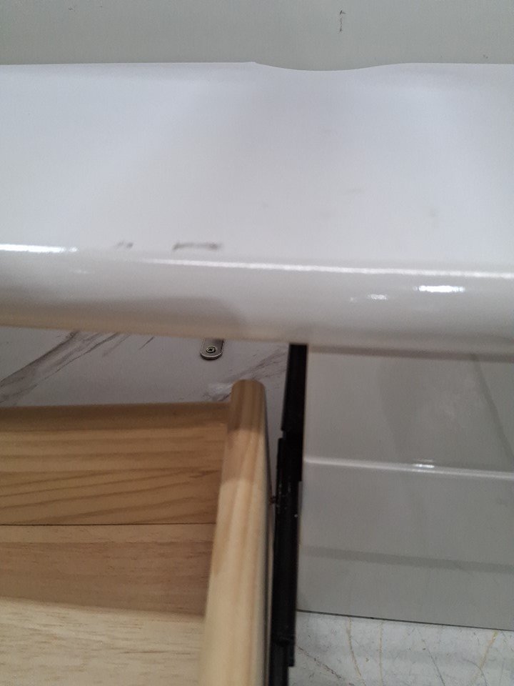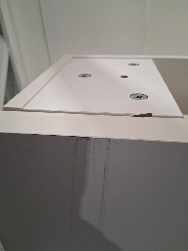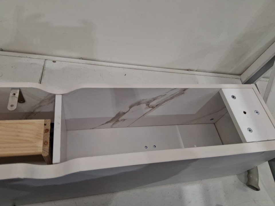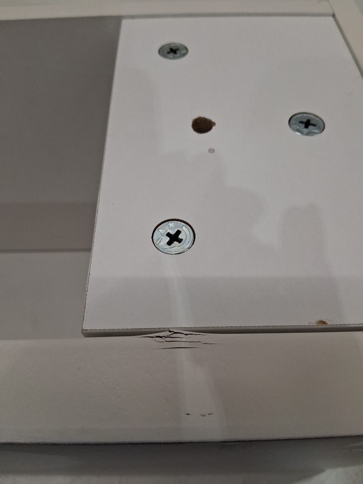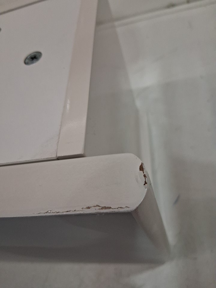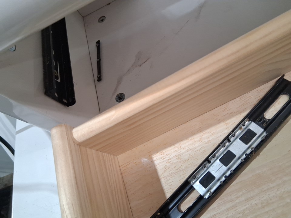 please note this item has some broken and chipped areas, as well as some dirt/dust residue and the drawer slides will definitely need to be replaced. Additional generic hardware may be required for assembly