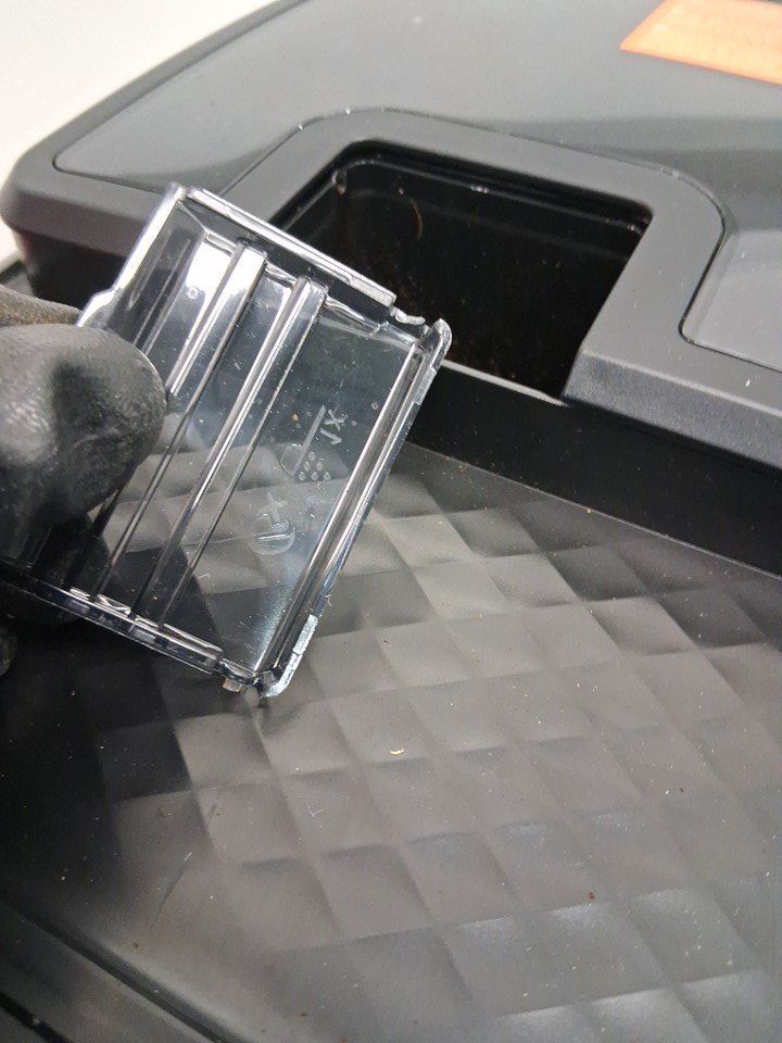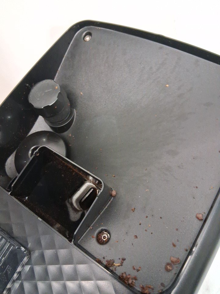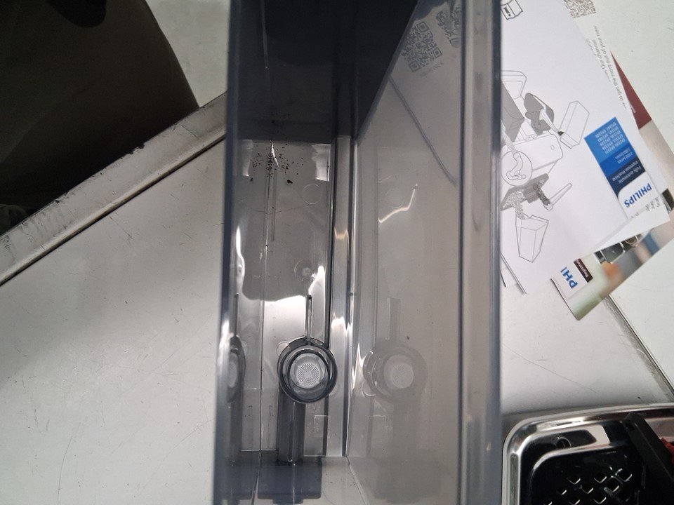 Missing milk frother attachment and water filter- small plastic lid on top is broken on one side (see photos) - item has coffee grounds/stains from prior use