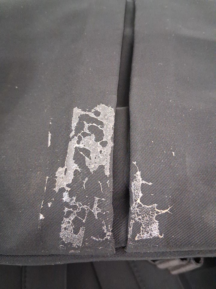 Tape adhesive on bottom of bag from original packaging. (See photos)