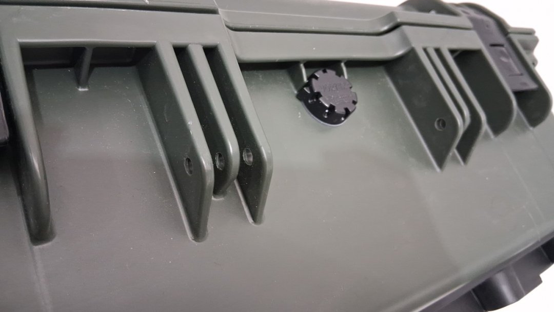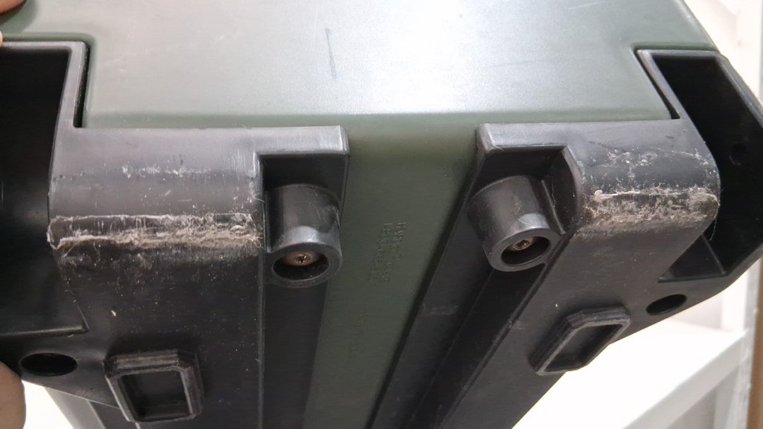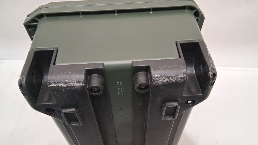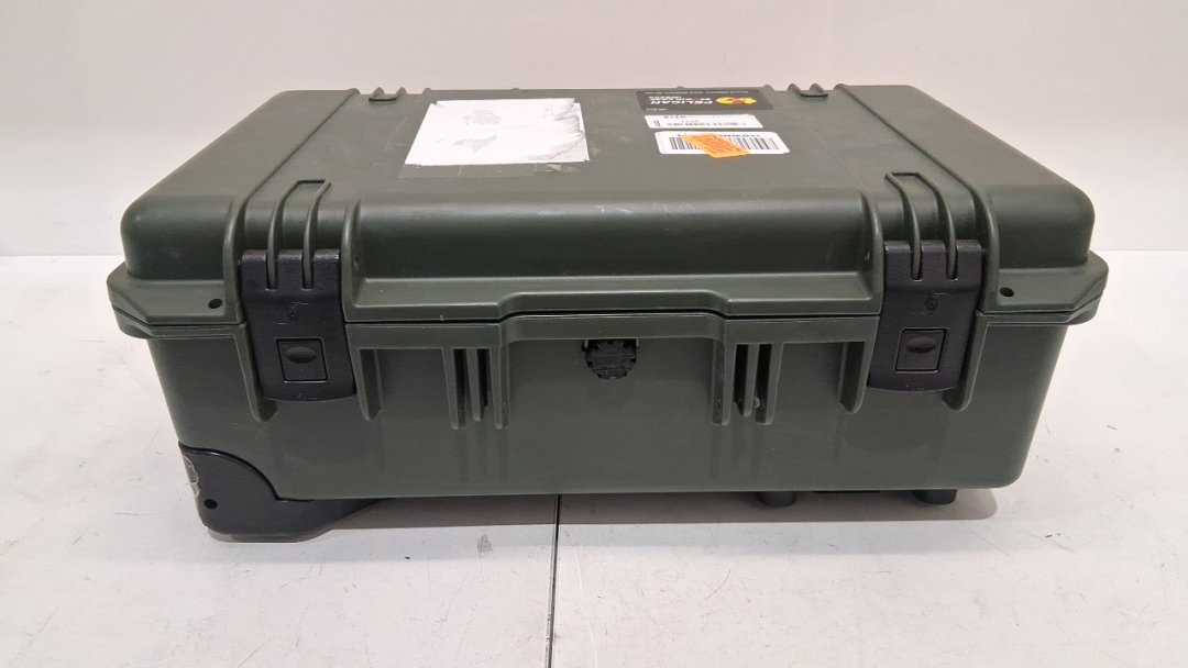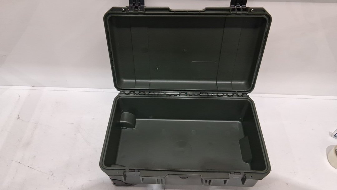 the wheels and handle are missing, there is adhesive residue on the outside, the foam is missing from the inside. there are scuffs and scratches on the outside