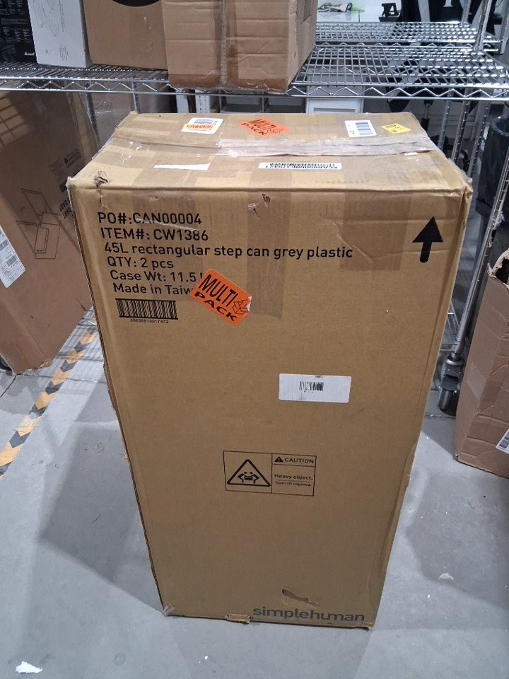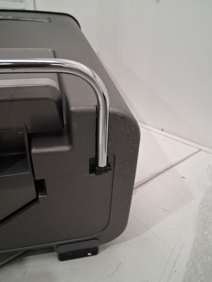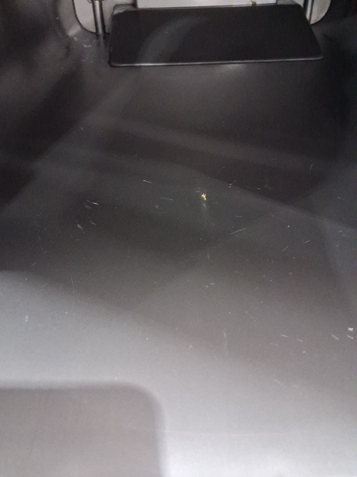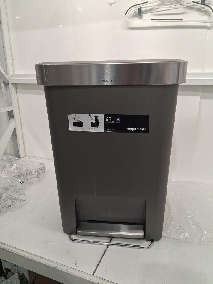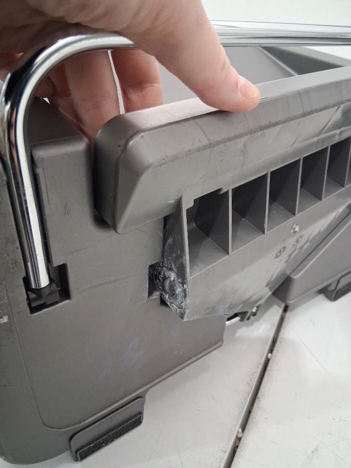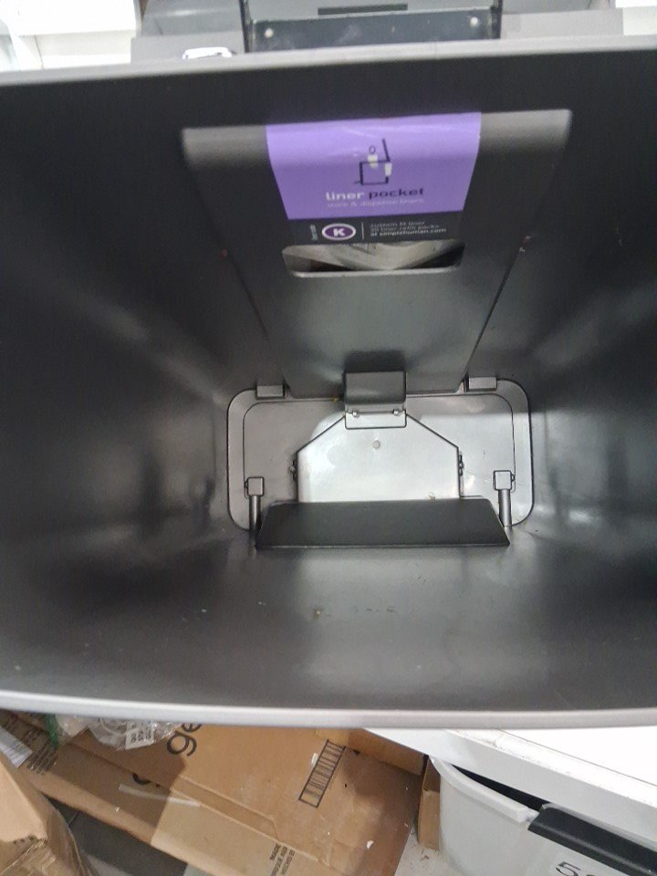 trash can has visible food stains on exterior and interior, Step pedal is broken on one side and metal bar has come out on one side
