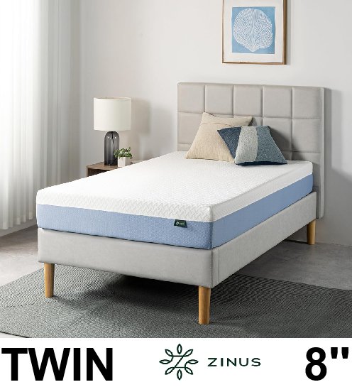 ZINUS GREEN TEA ESSENTIAL MEDIUM FEEL MEMORY FOAM MATTRESS - 8'' - TWIN - WHITE/BLUE