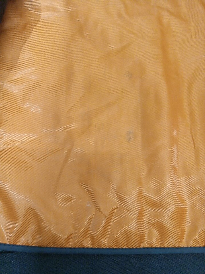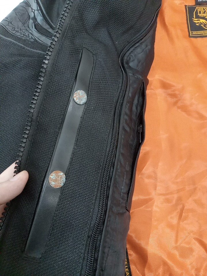 Some pet hair on it, the buttons on the inside on one side have oxidized and rubbed off on the inside of the jacket.