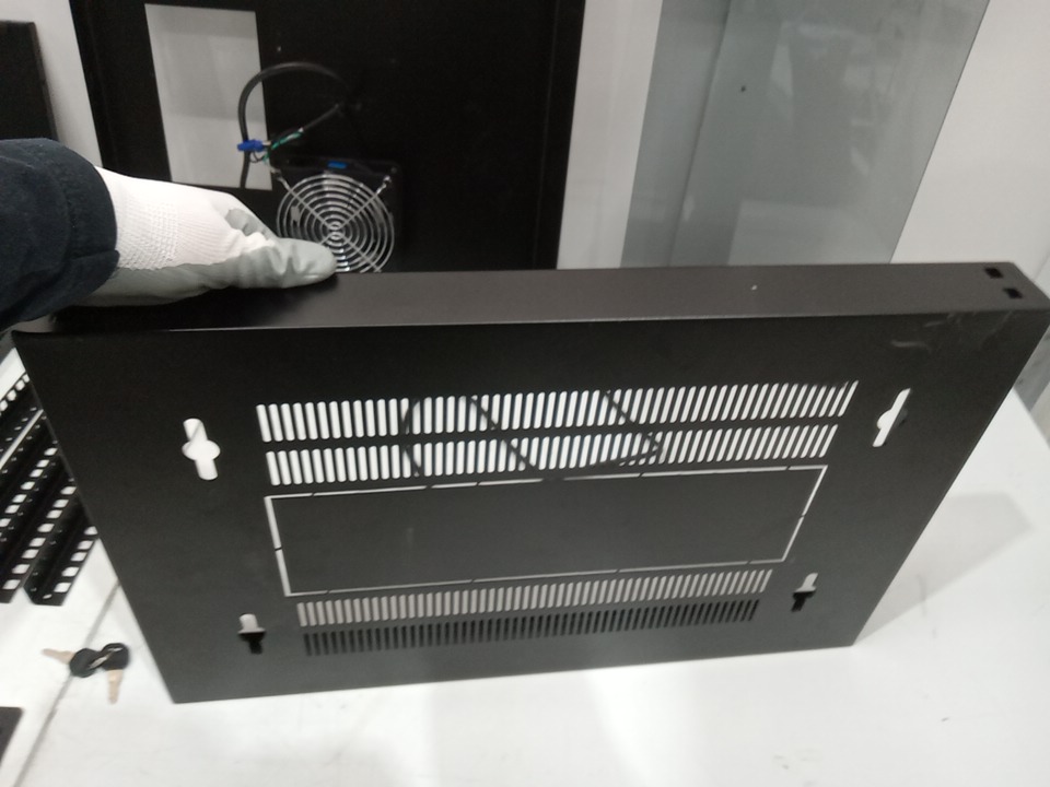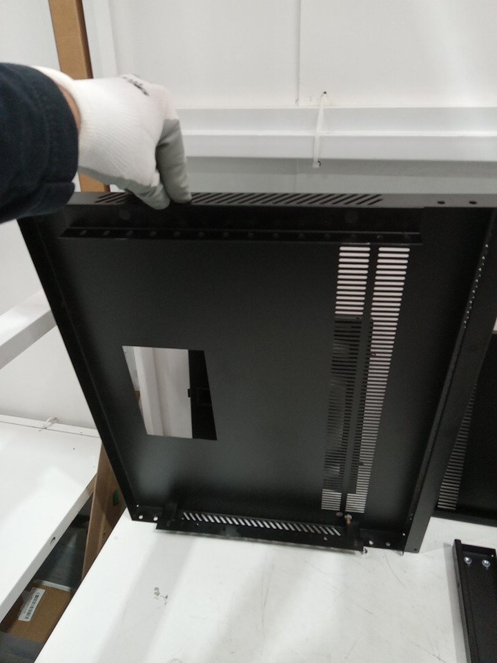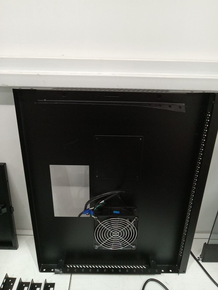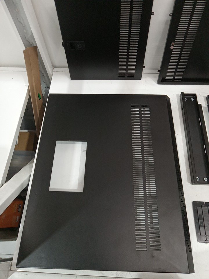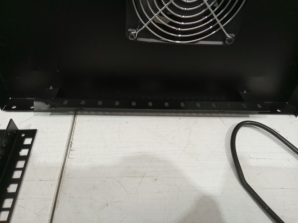 Please note that the top panel’s inner edges have dents, and the frame’s inner edges need to be bent back in order to place the panel on top. The fan does not spin and will need to be replaced for proper functioning. All generic hardware is missing from the original packaging and will be required to install the product. There are also scratch marks around the frame. (Please see photos)