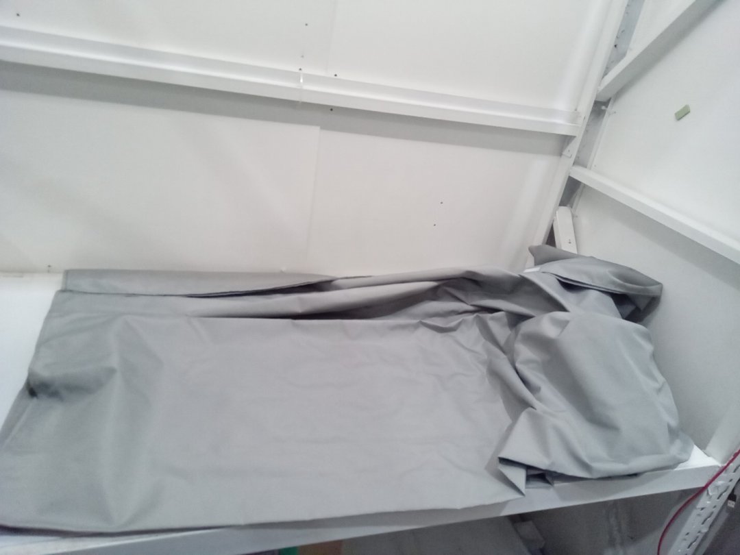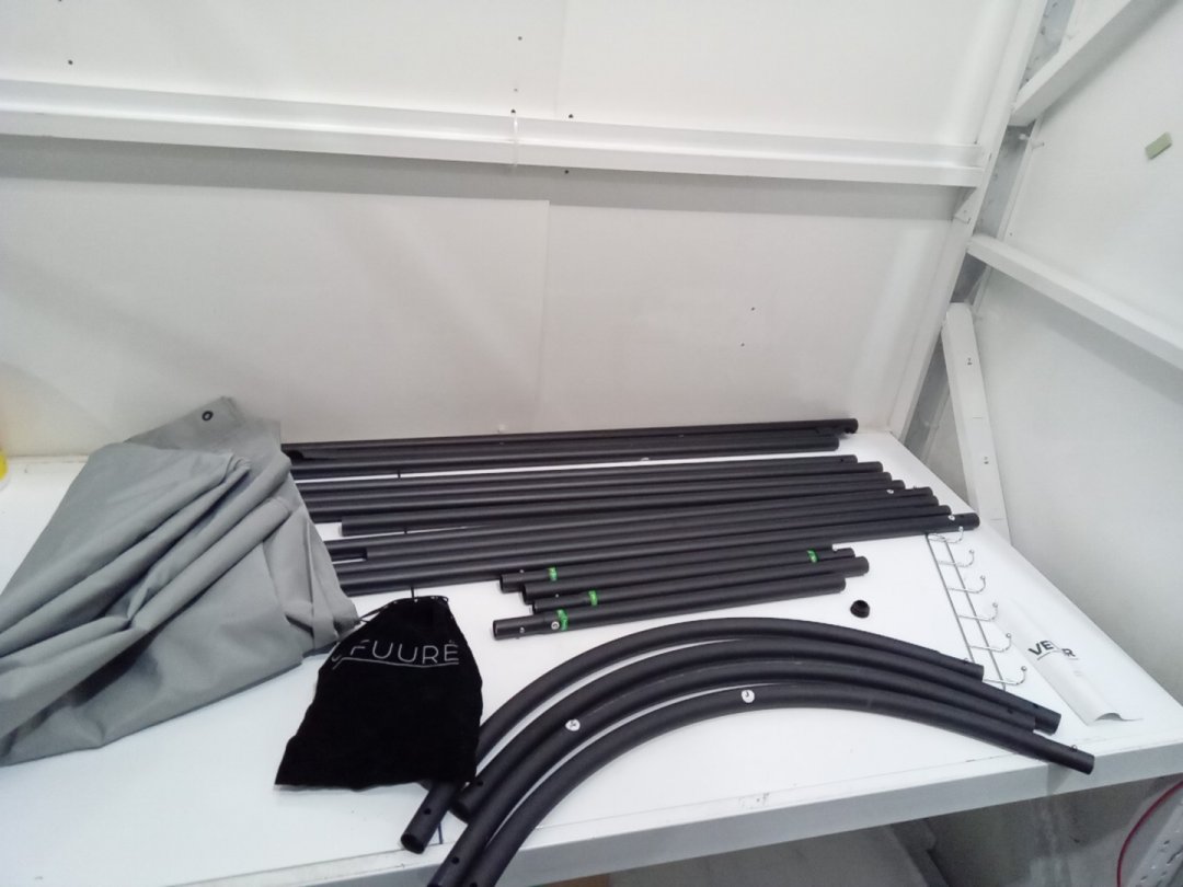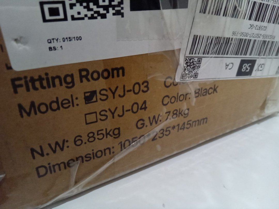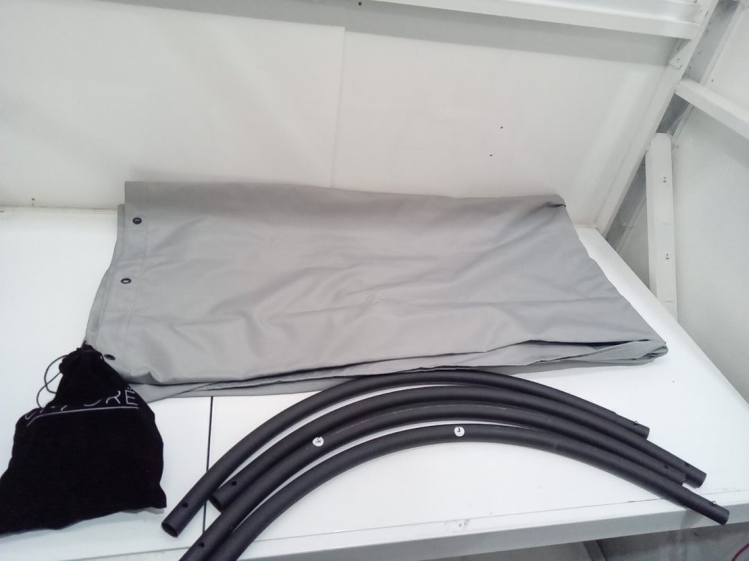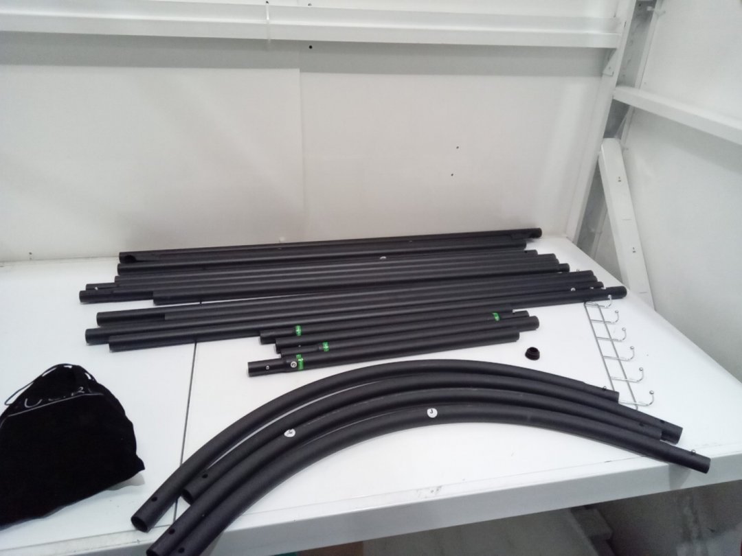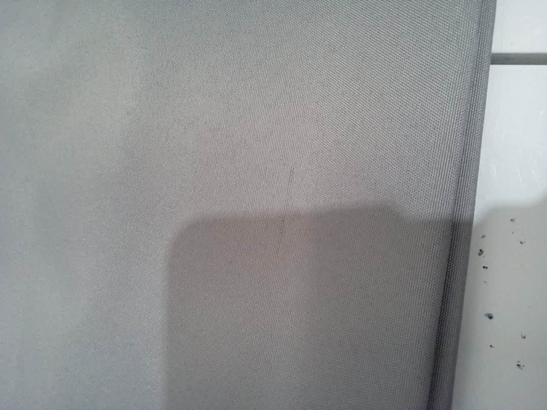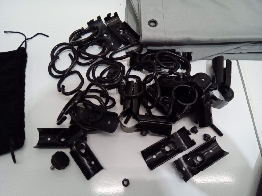 There are markings on the circular bars and a snag in the fabric of the curtain suggesting prior use.