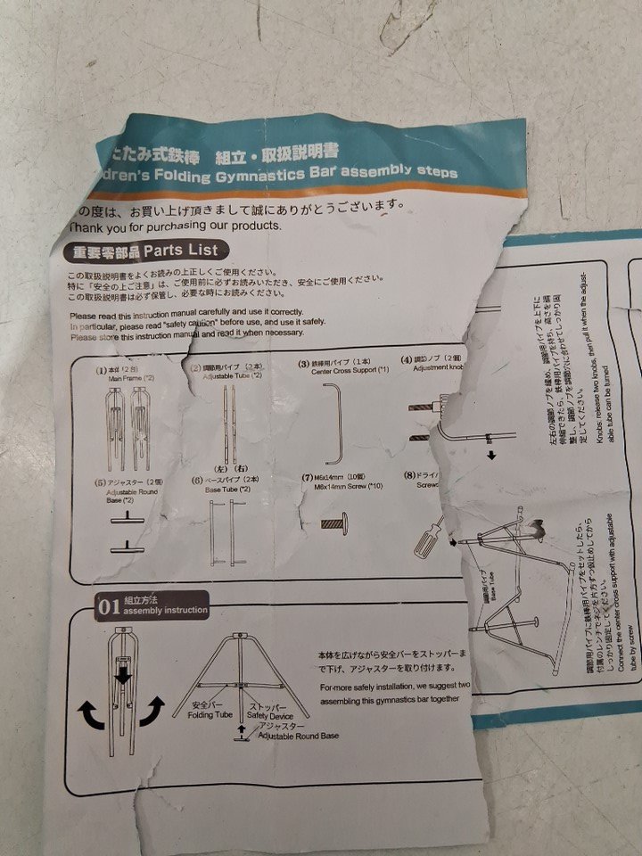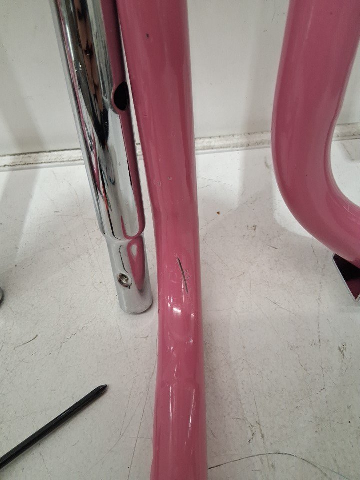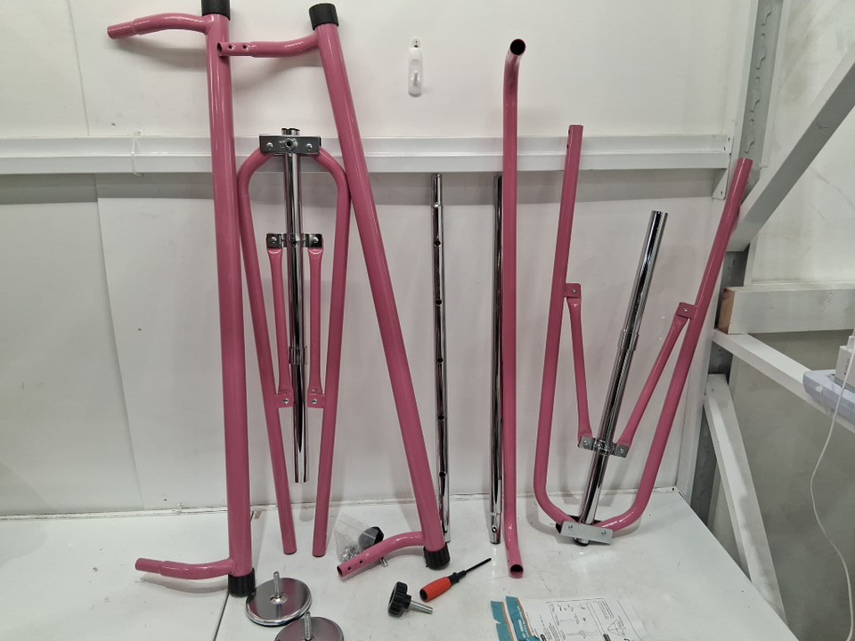 Scuffs and scratches indicate prior assembly. Item appears to be missing foam pad protectors and hanging handles.