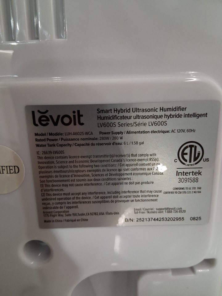 LEVOIT LV600S SMART CONTROL HYBRID ULTRASONIC HUMIDIFIER - 6L - WHITE (MODEL: LUH-A602S-WCA)