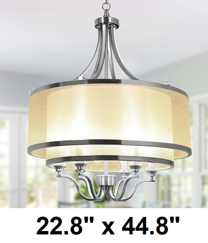 depuley 6 light large pendent chandelier with double fabric shades - 22.8" x 44.8" - e12 bulbs - 3000k to 6000k - silver/white (model: WS-FND104-40B-6-BL)