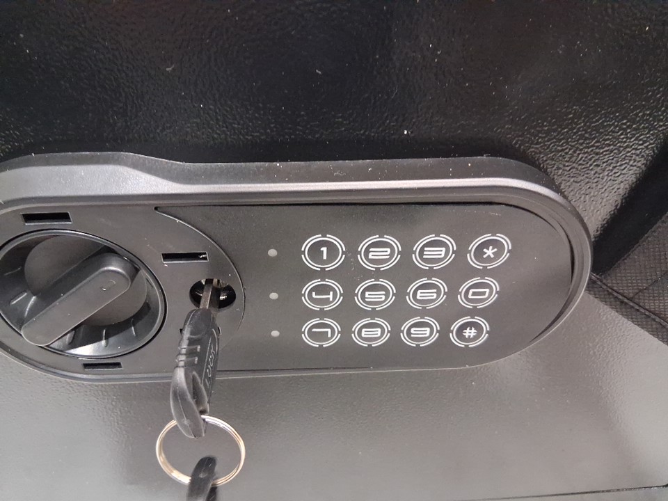 Digital keypad is coming unstuck, should be able to re stick to safe front. Tested for power, working