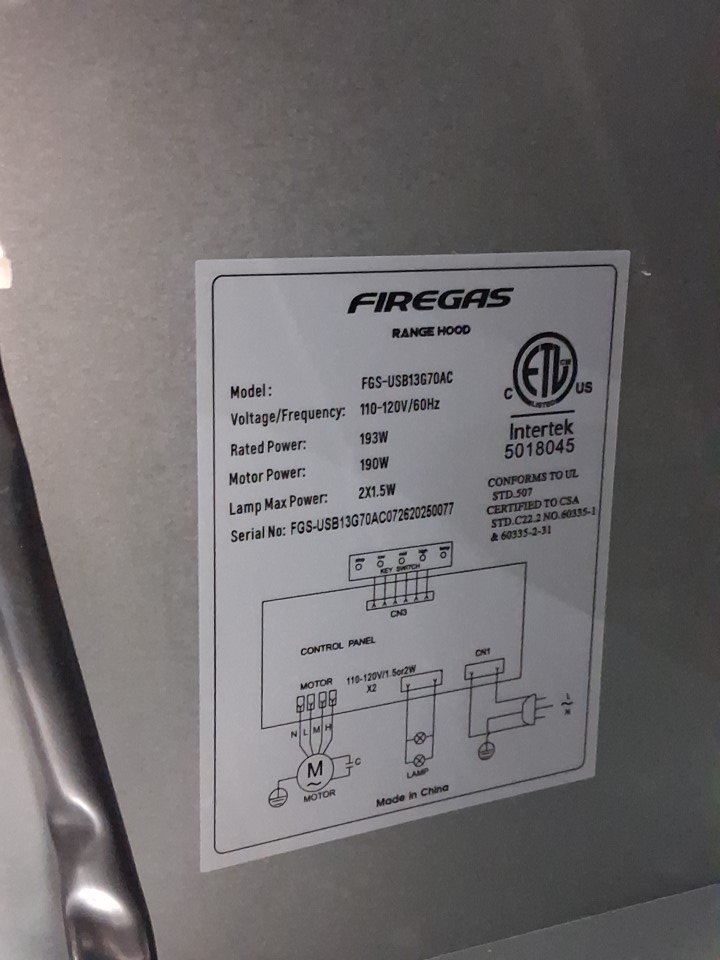 FIREGAS under-cabinet electric built-in Hood range with charcoal filter - 600 CFM - 30"- stainless steel (MODEL: FGS-USB13G70AC)