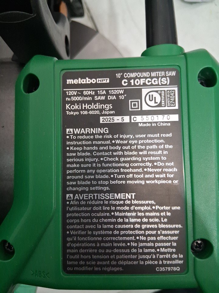 METABO HPT CORDED COMPOUND SINGLE BEVEL MITER SAW - 10" 24T TCT BLADE, 15A, 5000RPM - GREEN/SILVER - (MODEL: C 10FCG(S))