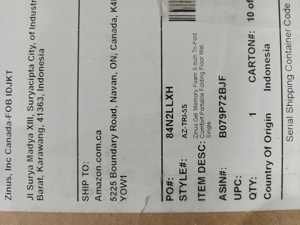 ZINUS 5" GEL MEMORY FOAM TRI-FOLD COMFORT PORTABLE FOLDING MATTRESS - SINGLE/COT SIZE - WHITE (MODEL: AZ-TRI-5S)