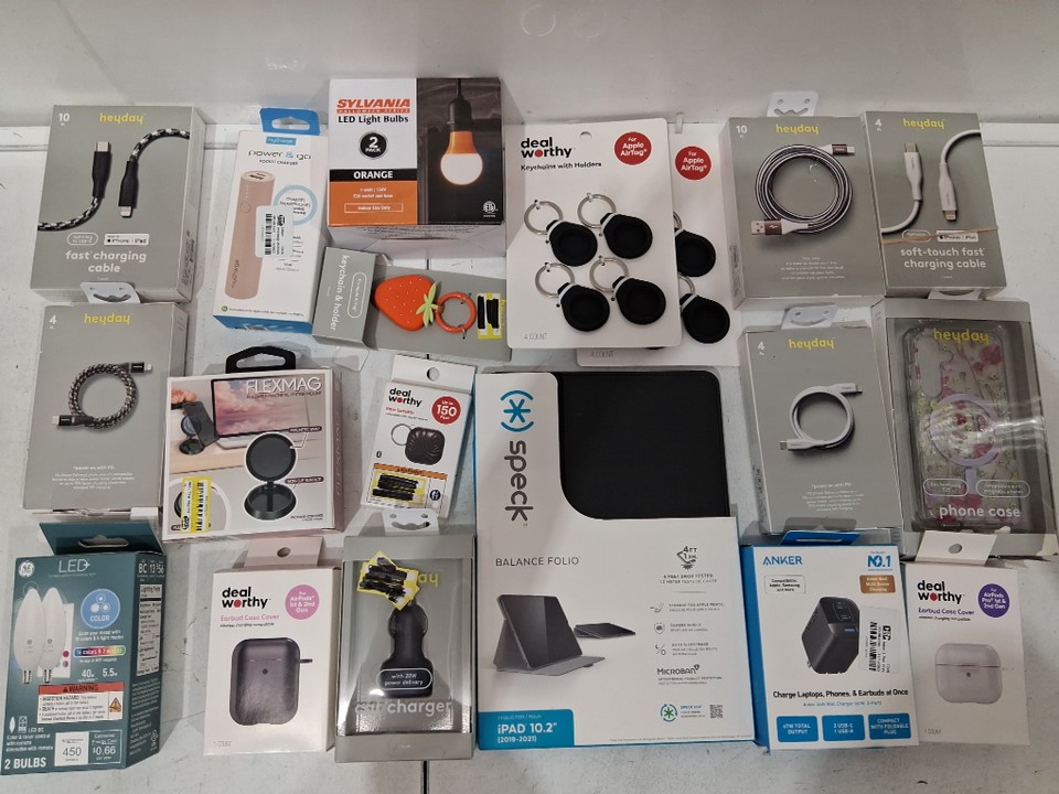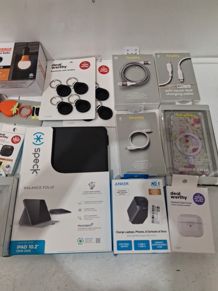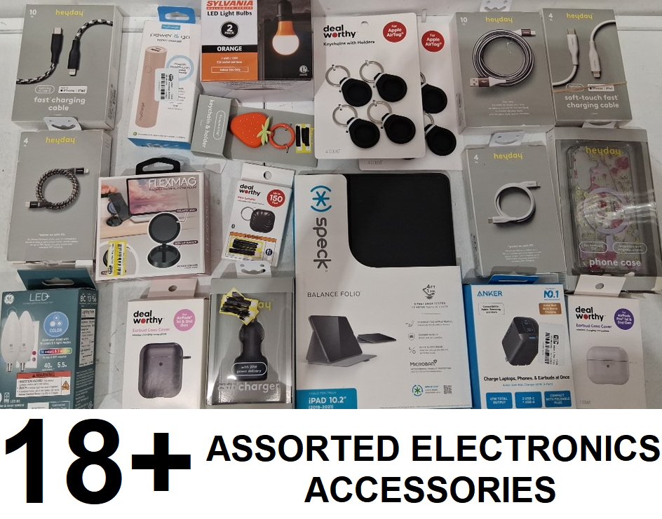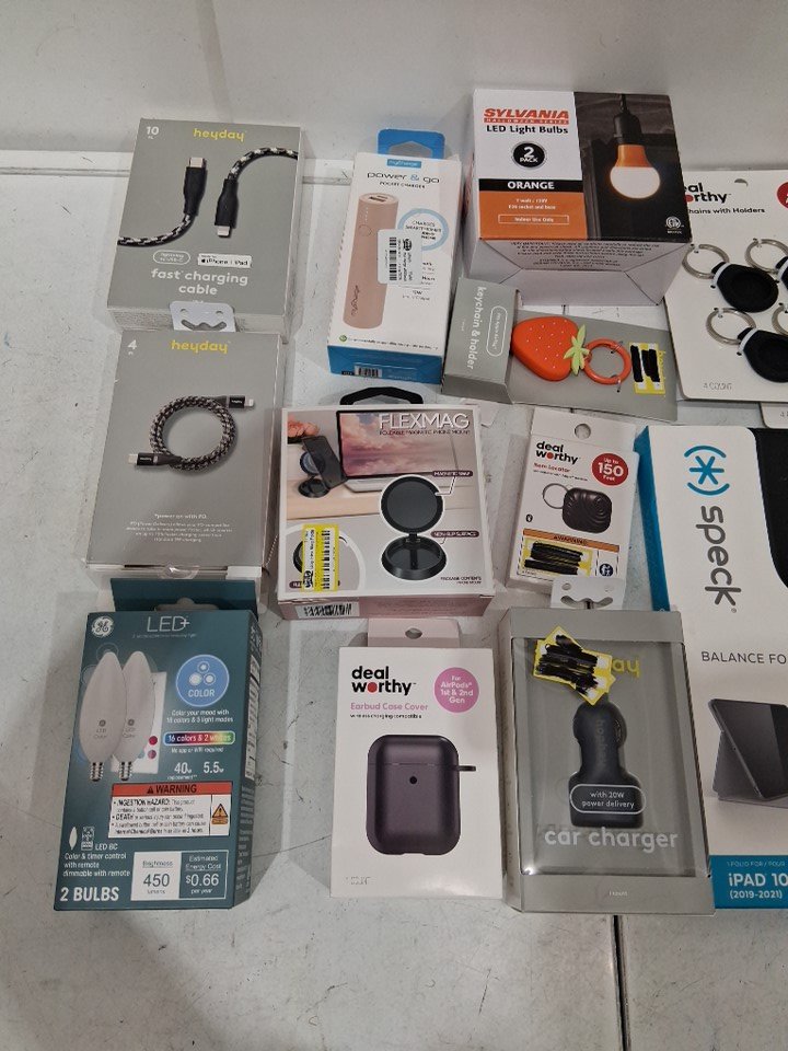 18+ ASSORTED electronics accessories - usb cables, phone/ipad cases, light bulbs, light blbs and more