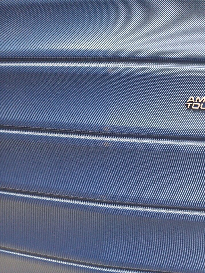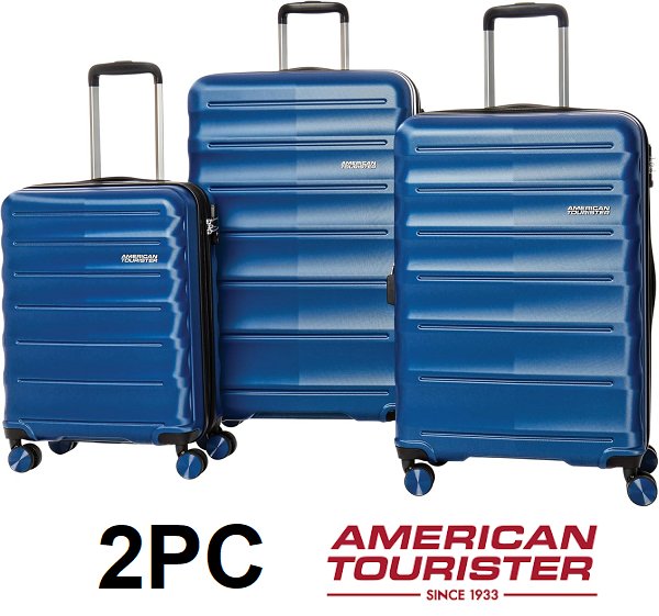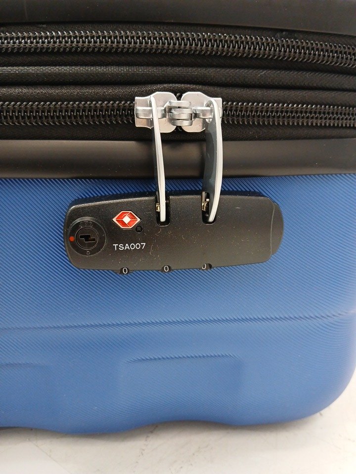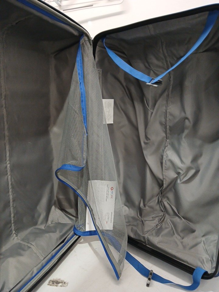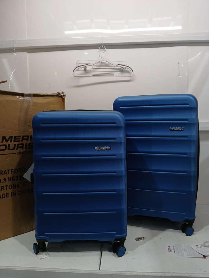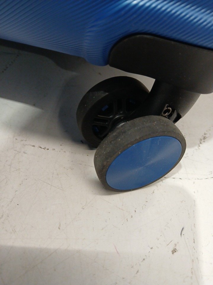 Missing the smaller suitcase. The surface of the large one is scuffed and the wheels show wear.
