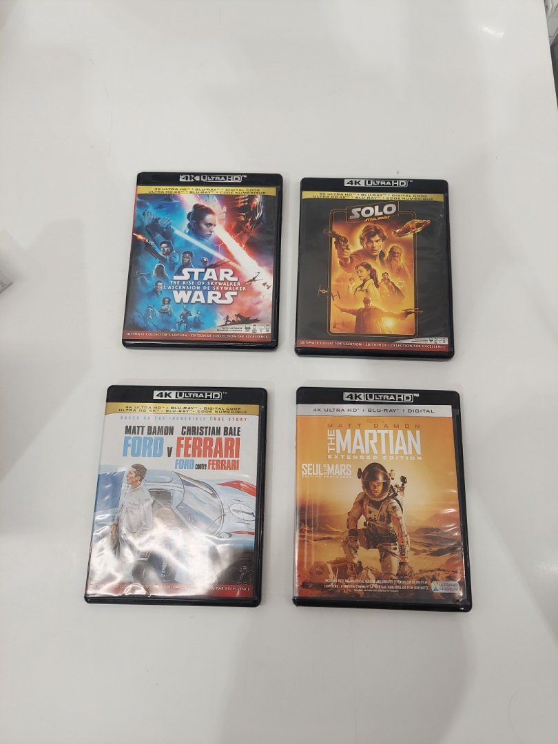 Please note that upon inspection there is minor cosmetic scratches on the ford v ferrari uhd disc & the bonus feature disk of solo but these should not effect function. see photos.