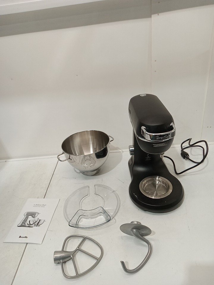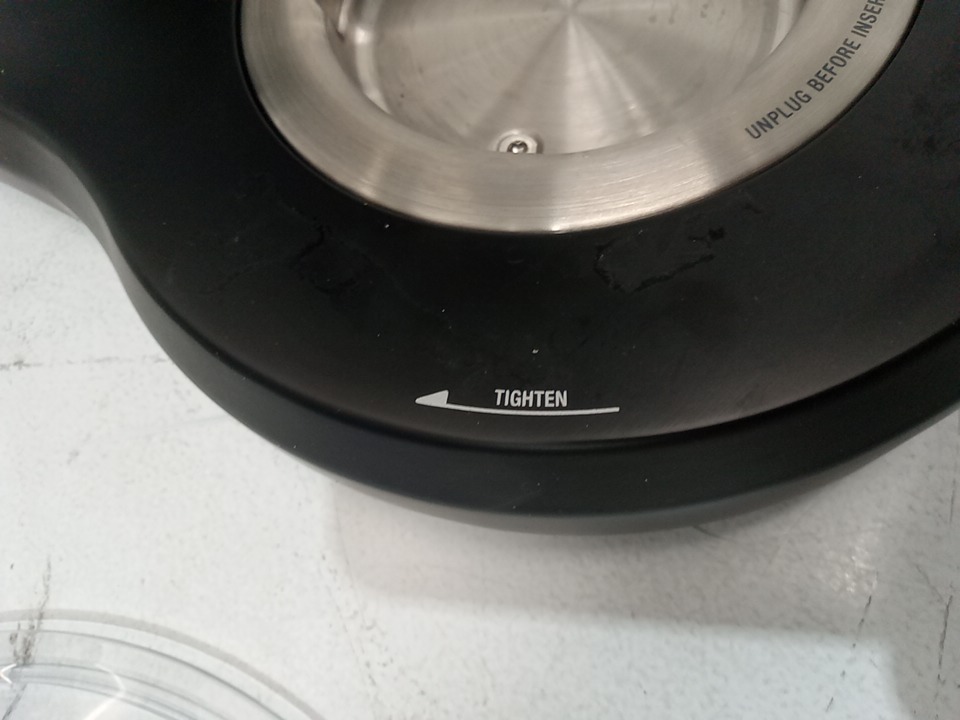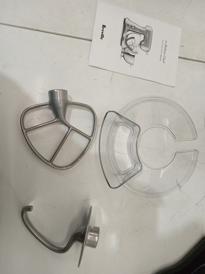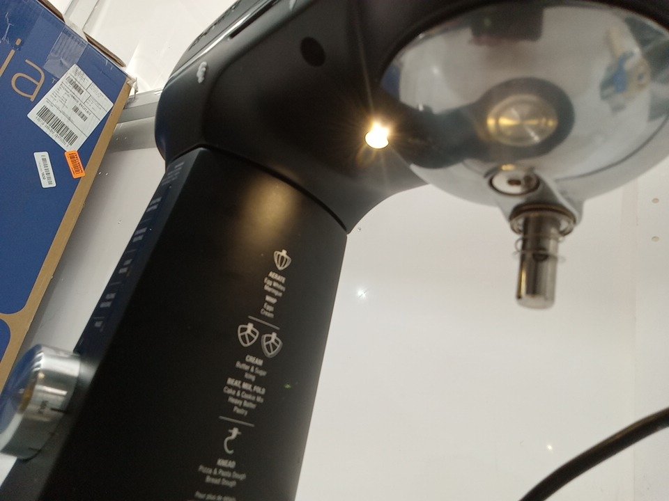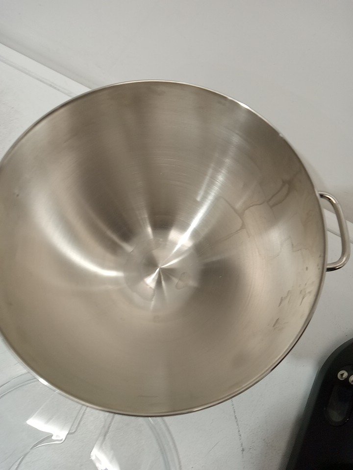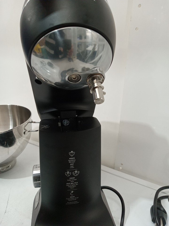 Item has scratches and stains present from previous use. It is also missing wire whisk and double scraper beater. Tested for power.