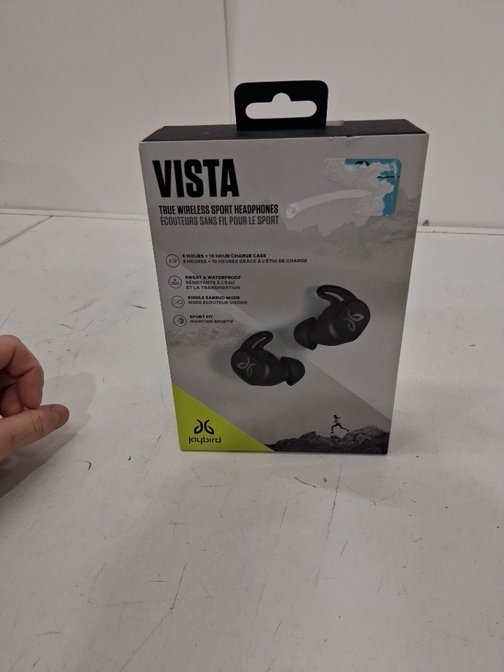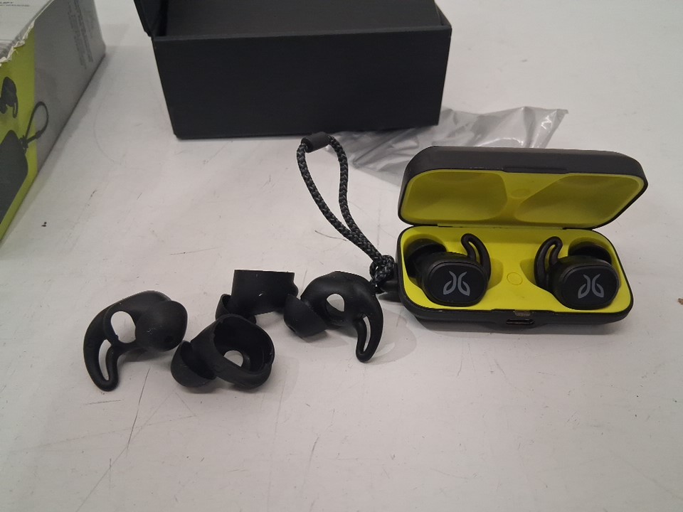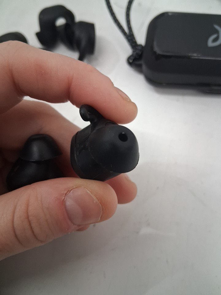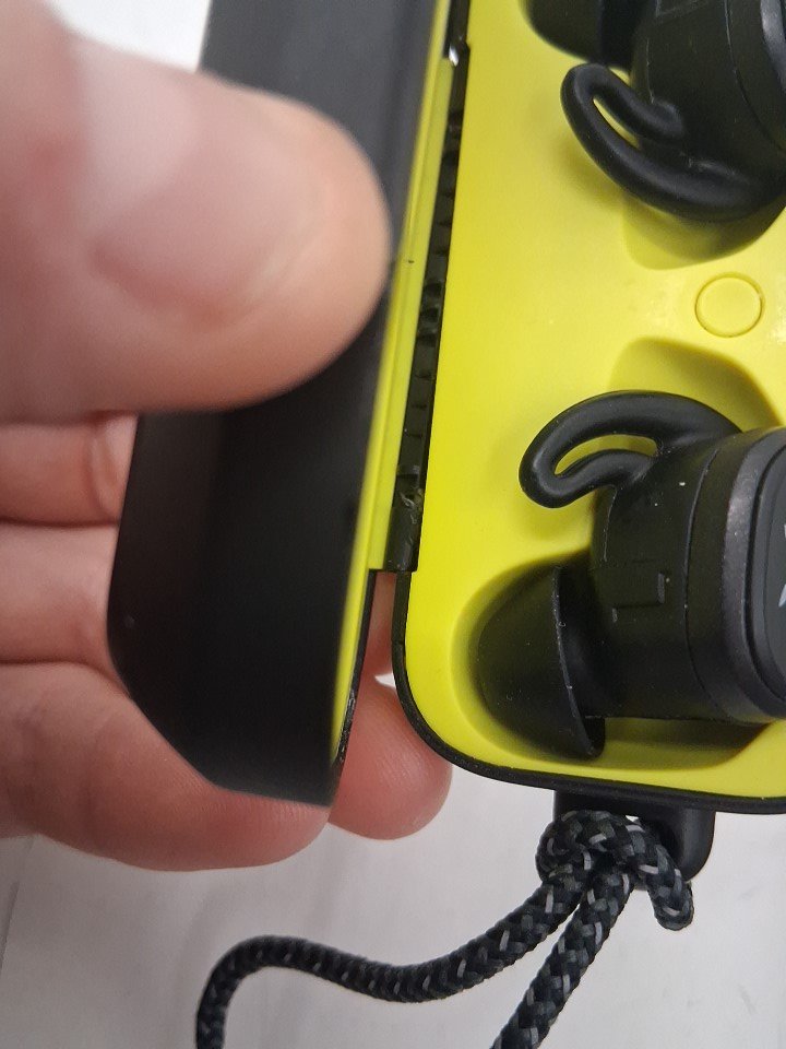 earbuds have light earwax on them. Case has scuffing on it, and hinge is cracked. Cord is missing. Has been tested for sound