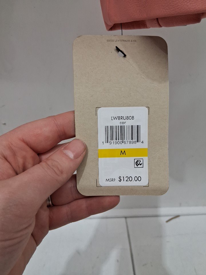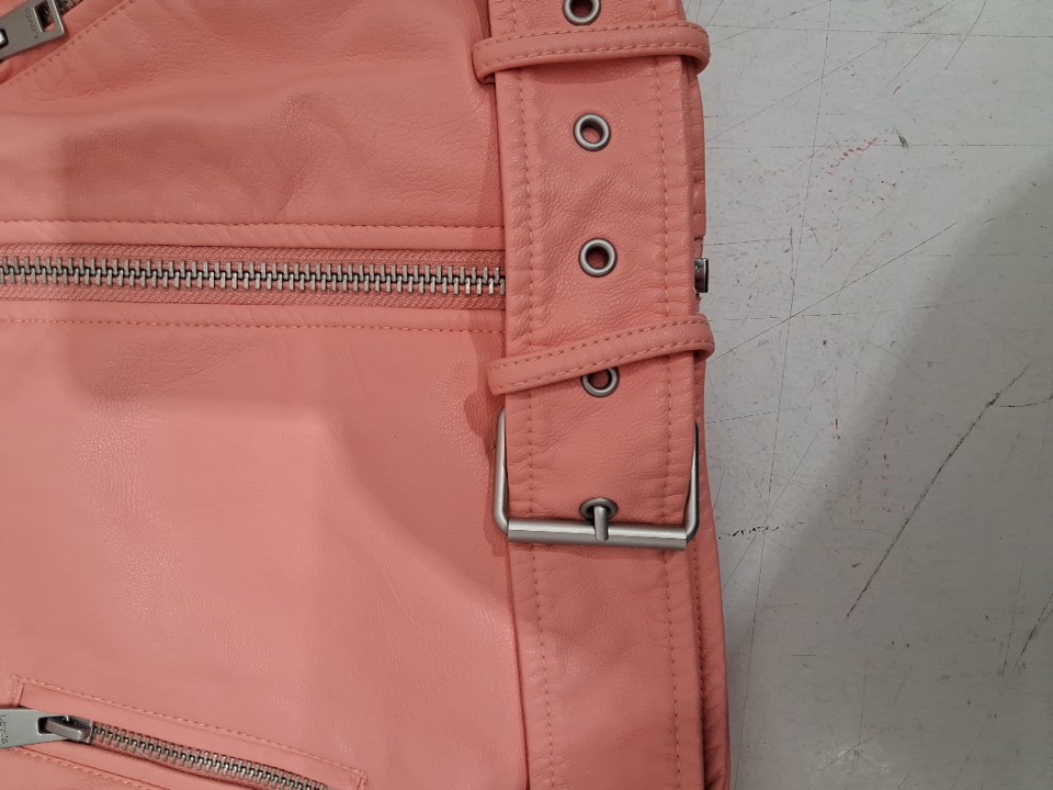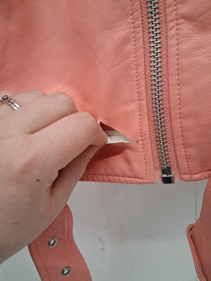 item has a small slice at the bottom of the jacket body; could be stitches, or covered with patch, the slice is also mostly covered with belt when done up