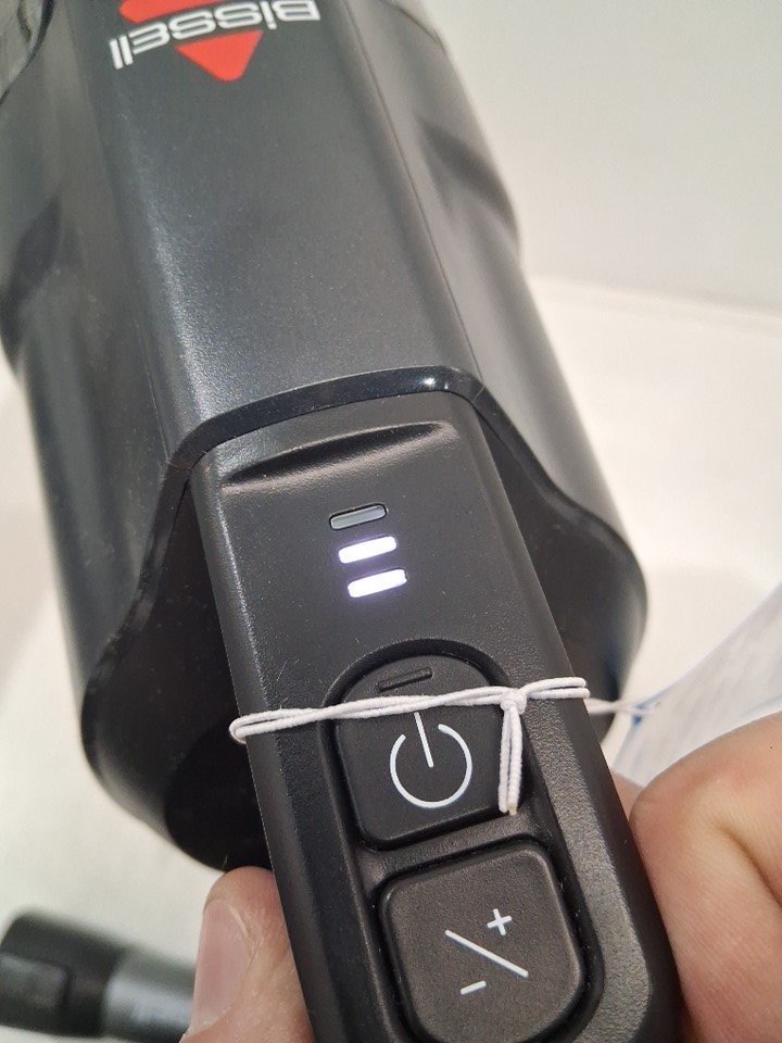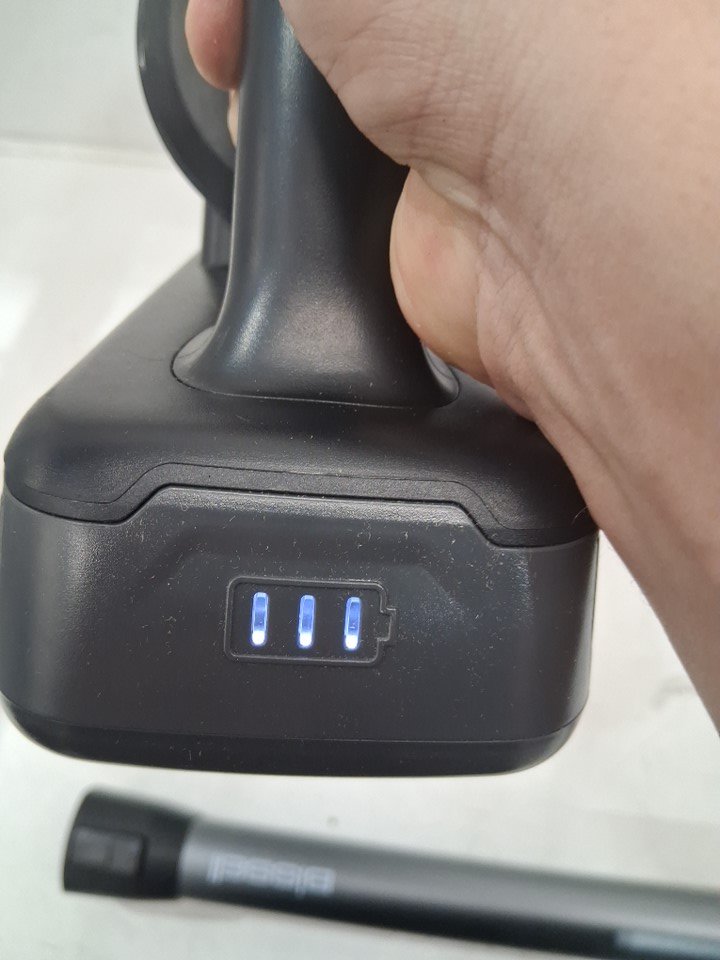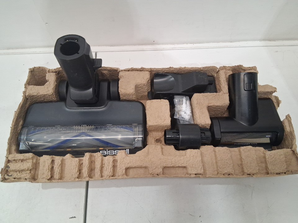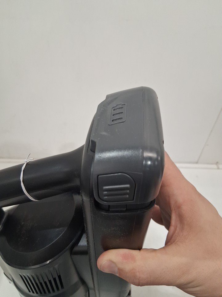 The charger appears to be missing from the packaging, so customer will need to supply their own replacement in order to recharge the vacuum's battery. There is also some dust left in the tank as well as some stuck on the underside of the vacuum heads indicating some previous use - see photos. Outside of the missing charger and the signs of use, there are no visible issues with the vacuum or any parts, and function appeared normal when tested.