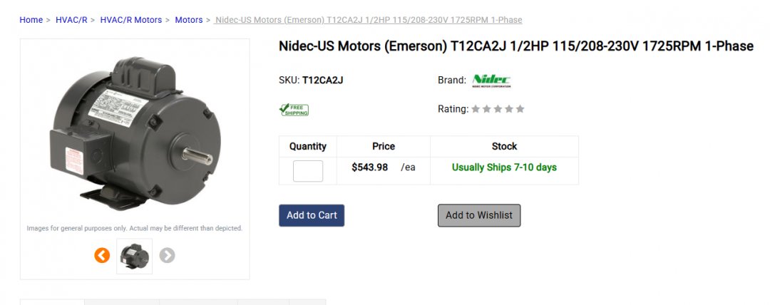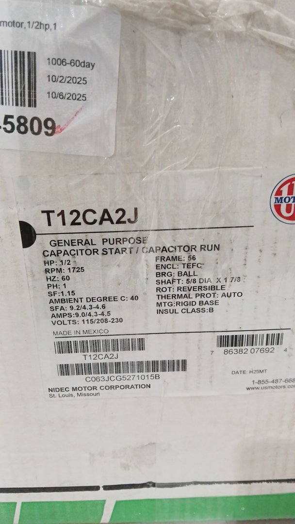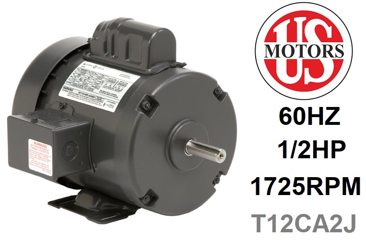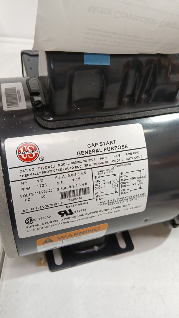 NIDEC US MOTORS EMERSON 1/2HP GENERAL PURPOSE SINGLE PHASE MOTOR - 1725RPM - 60HZ - BLACK/GREY (MODEL: T12CA2J)