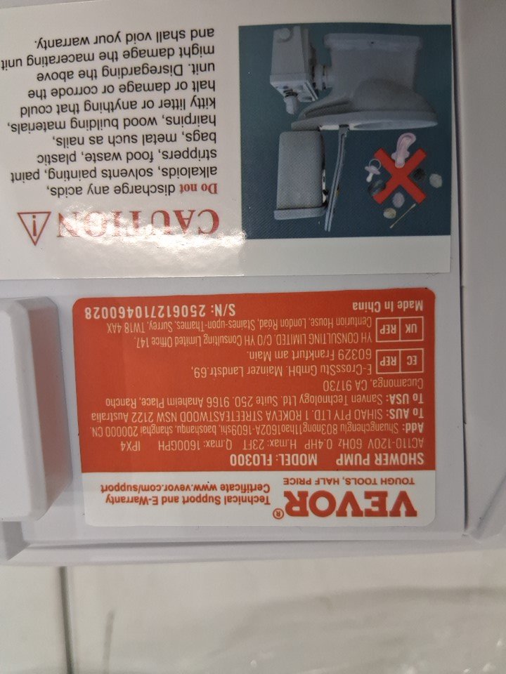 VEVOR Copper Motor Shower Pump - 110-120V, 350W, 1600GPH - White (Model: FLO300)