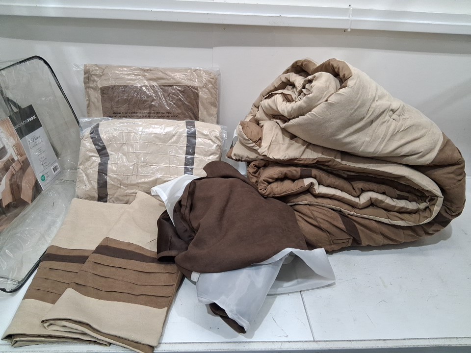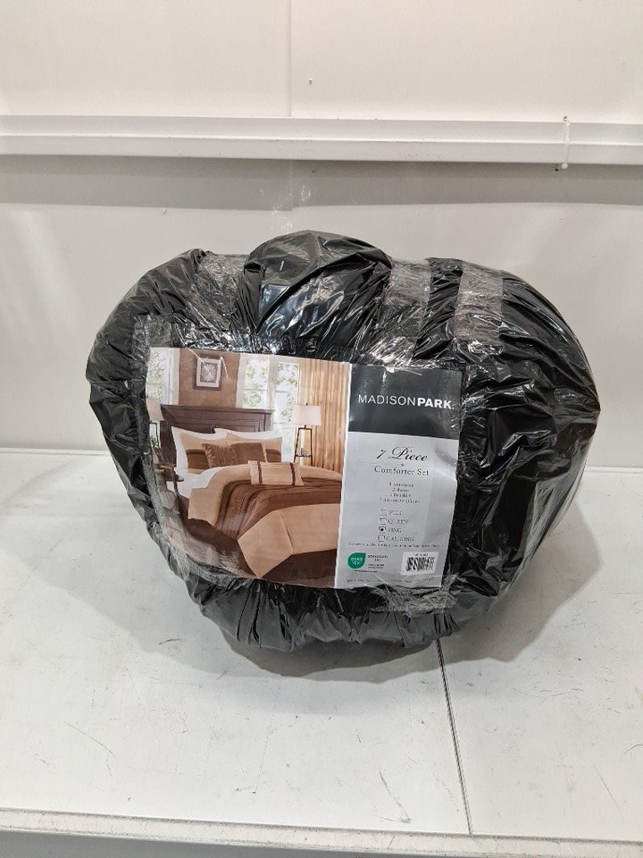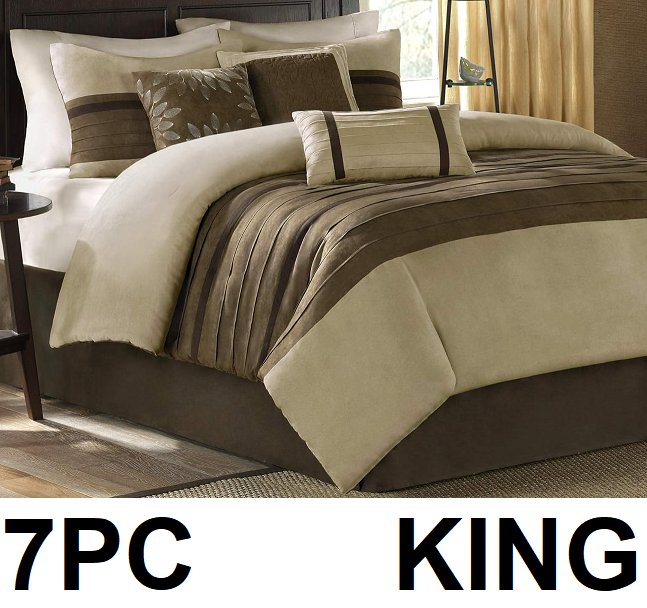 7pc madison park palmer comforter bedding set - (1) comforter, (3) decorative pillows, (1) bed skirt, (2) shams - brown / beige